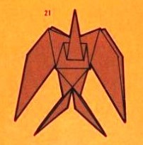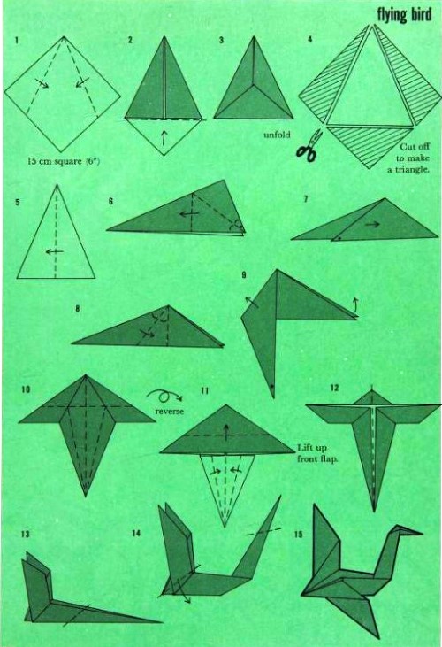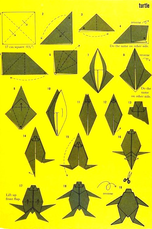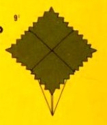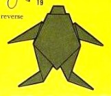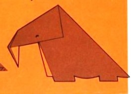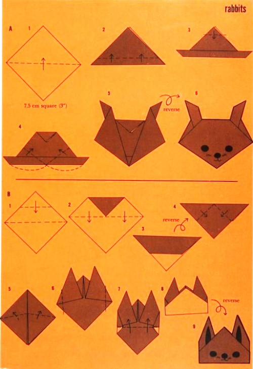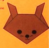 'Fold-and-Paste Origami Storybook' by Florence Sakade was published by Charles E Tuttle Company in Vermont and Tokyo in 1964. It is a book of children's stories illustrated by paperfolds. Unlike the author's previous similar work, this one does not contain folded copies of the paperfolds, but provides decorative pages onto which designs folded by the reader can be glued. A pack of suitable paper was supplied with the work. I have not reproduced the stories or the decorative pages. This page only provides details of the folding instructions. Many of the designs are cut and/or decorated (with eyes). A full copy of the work can be accessed online here. **********