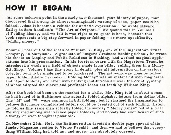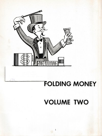 was published in 1963. The work is aimed at magicians. It encourages them to use money folding as a means of income, not only by demonstrating the folding process but also by selling the finished items. The main contributors to the work are: William King, of the Hagerstown Trust bank, who set up a Gift Shop of money related items within the bank premises (some of which involve folding dollar bills). Victor Frenkil, a businessman, CEO of Baltimore Contractors, and an expert in folding single dollar bills into letters, numbers, monograms and words of up to five-letters. The information the work contains on Victor Frenkil can be found here. The work also contains designs for money folds by Neal Elias, John Nordquist and Robert Neale. **********