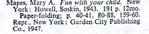'Fun with your Child' by Mary Mapes was published by Howell, Soskin in New York in 1943. This work is mentioned in Gershon Legman's 'Bibliography of Paperfolding' which was published in 1952.
