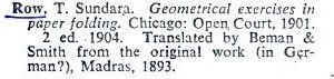 'Geometrical Exercises in Paperfolding' by Tandalam Sundara Row was self-published in Madras in 1893. This work is mentioned in Gershon Legman's 'Bibliography of Paperfolding' which was published in 1952, although Legman appears to have believed that the original work was written in German.