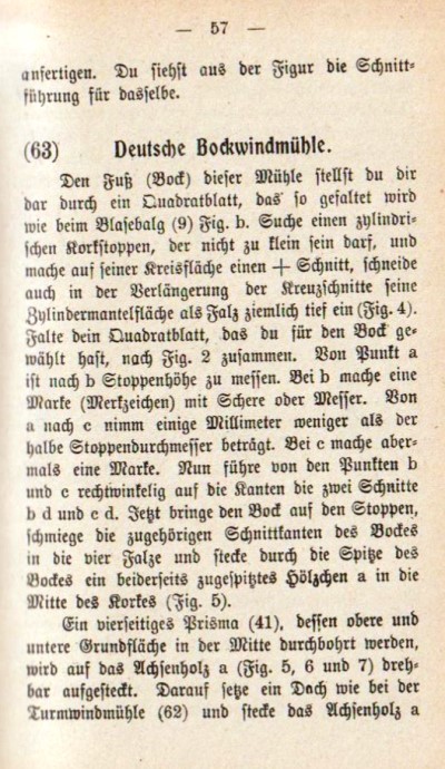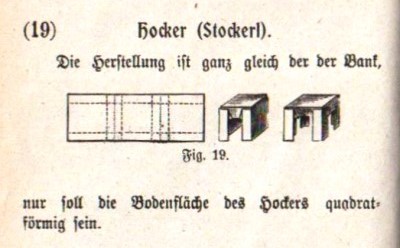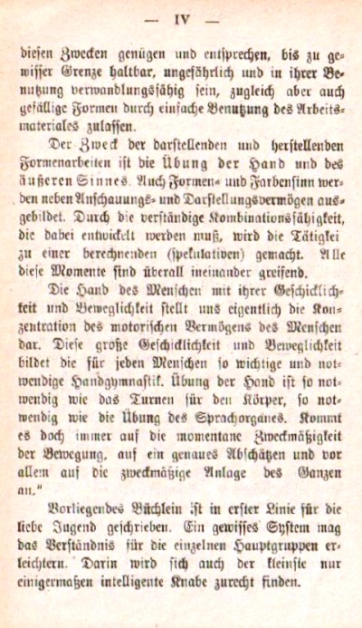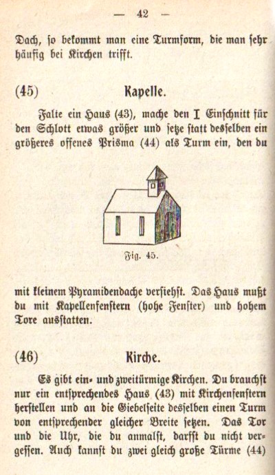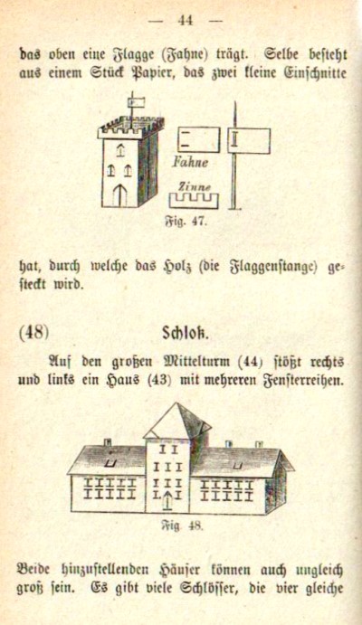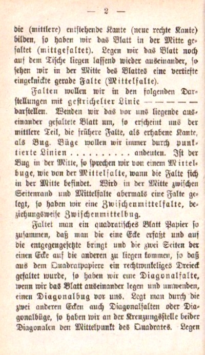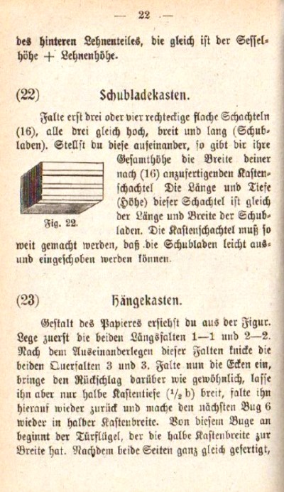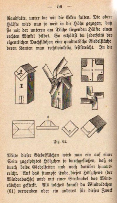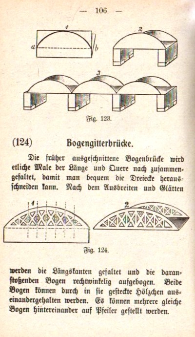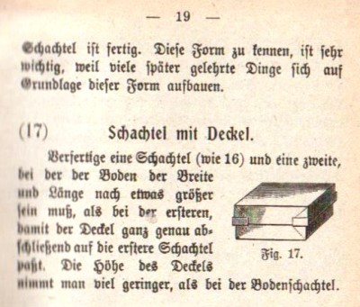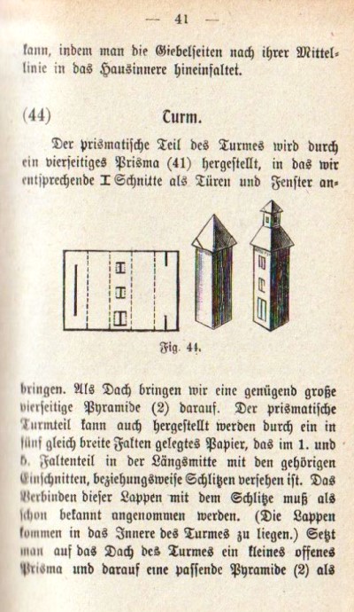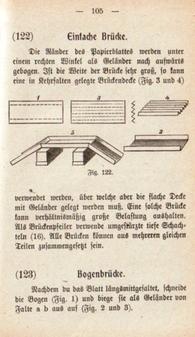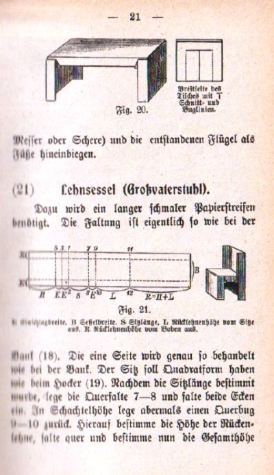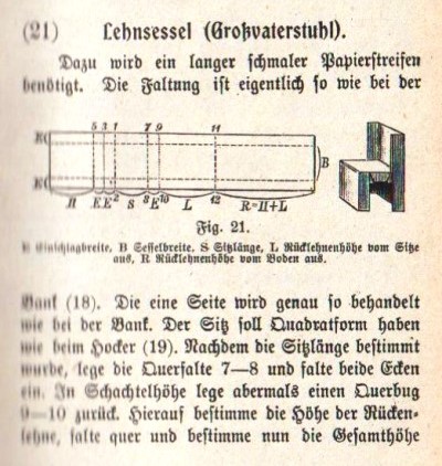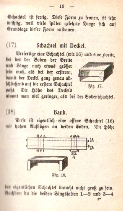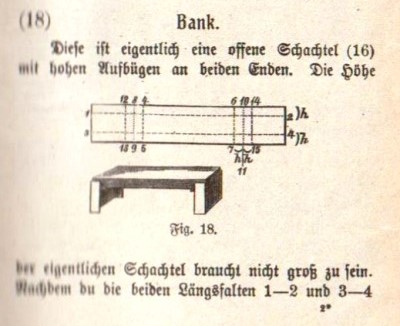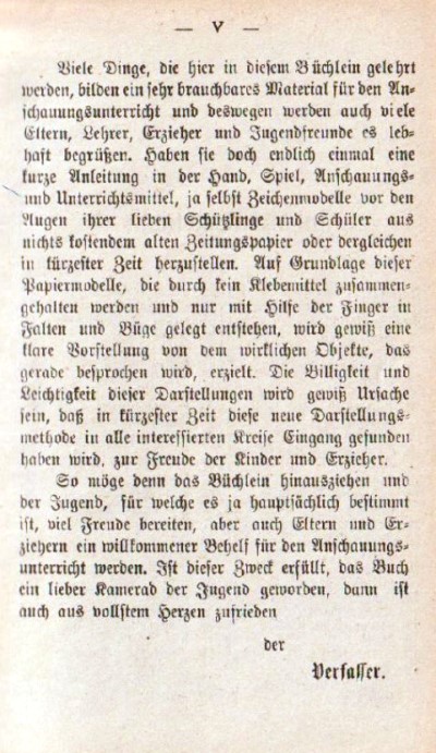 Wien and Leipzig in 1904. Paperfolding designs are scattered throughout the book, sometimes as complete designs and sometimes as elements in designs largely made using cardboard modelling or paper sloyd techniques. None of the designs require glue but some of them are designed to hold together by means of interlocking tabs and pockets. There is also an appendix about 'Das Bilderausschneiden' (Cutting Out Pictures). I have not included details of this appendix on this page, since it only includes minimal reference to paperfolding. This page is based on the 1922 second edition, a copy of which was kindly made available to me by Birgit Ebbert. As far as I know the content of the first and second editions is identical. A low-res copy of the whole work, apart from the appendix, appears at the foot of this page. The Foreword (see below) states that the book is primarily intended 'to bring much joy to young people' but that it will also serve as 'a welcome aid for parents and educators'. The author also states that the 'paper models are not held together with any adhesive' and stresses that practices paperfolding helps to develop manual dexterity. ********** This work is mentioned in Gershon Legman's 'Bibliography of Paperfolding' which was published in 1952.