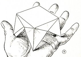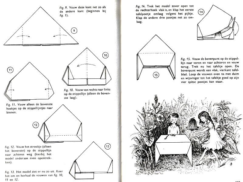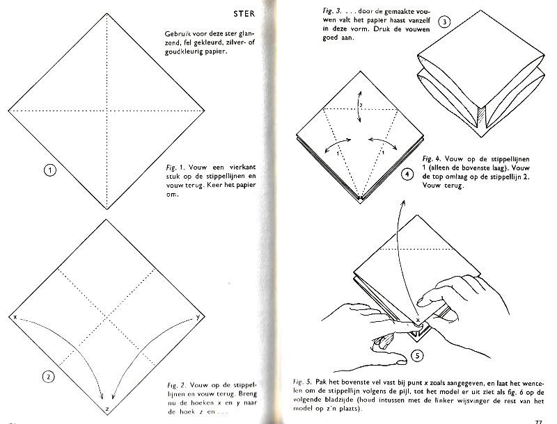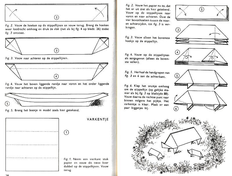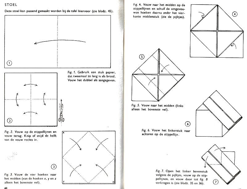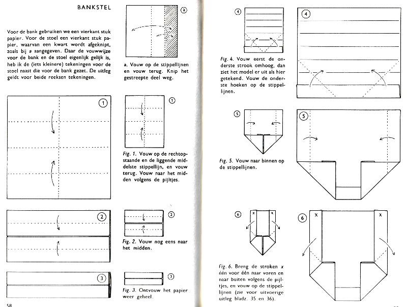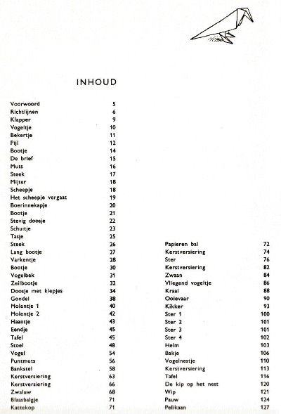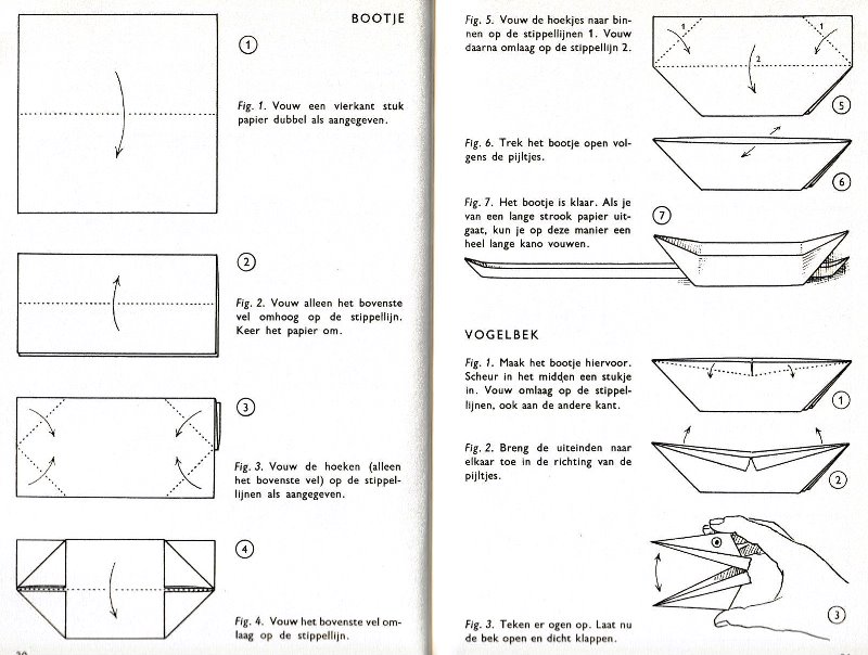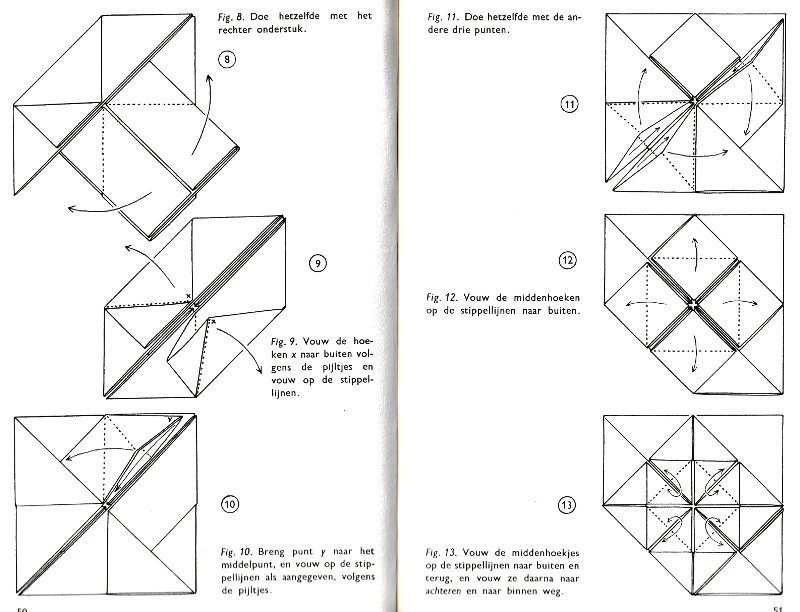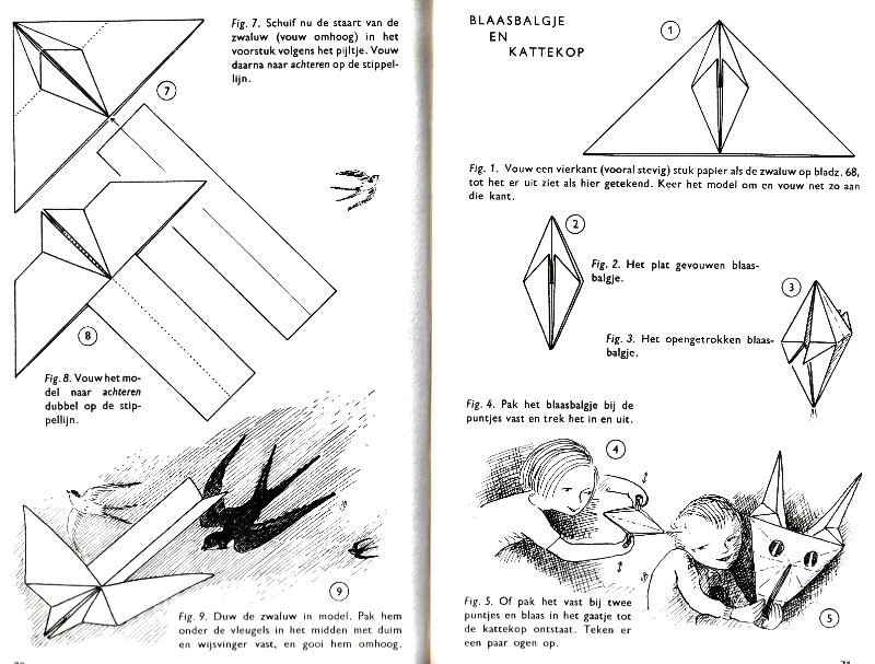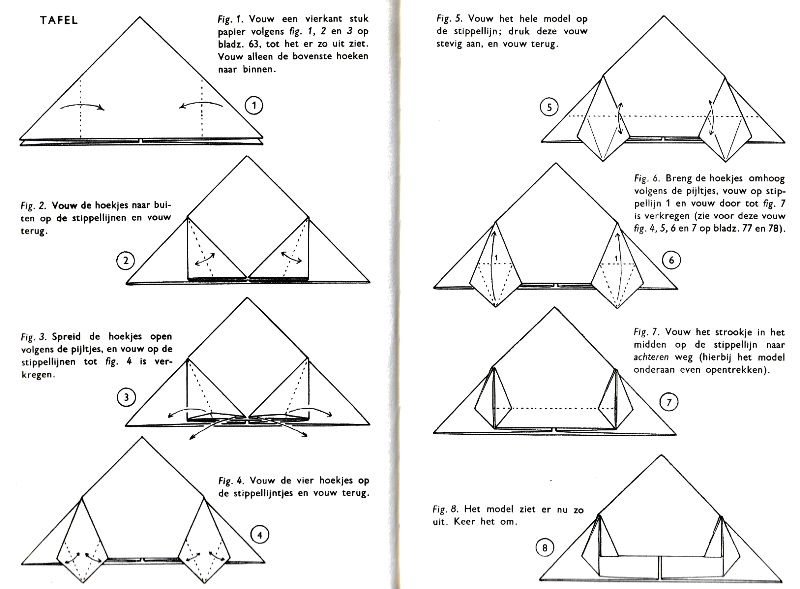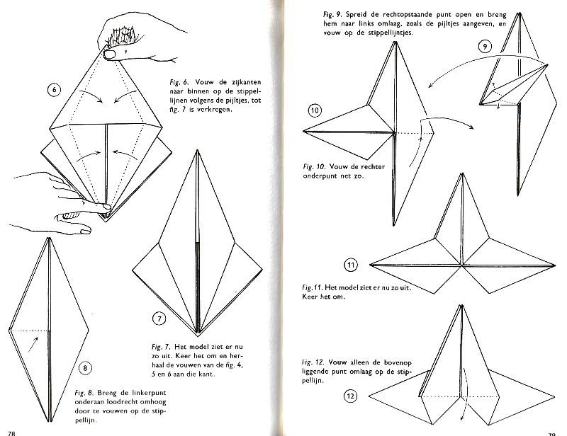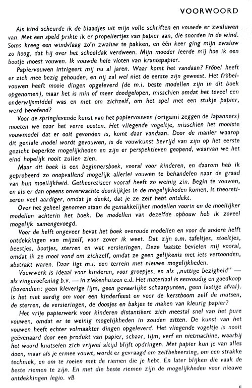 ********** Roughly translated this Foreword reads: 'As a child I tore the pages from notebooks and folded them into swallows (ie the swallow paper plane). I'd pin little paper propellors to them, which would whistle in the wind. Sometimes a gust would catch one of them, and once my swallow flew so high it disappeared over the school roof. My mother taught me how to fold a boat. I'd fold whole rafts out of newspaper. Paperfolding has intrigued me for years. Where does it come from? Froebel explored it, and he probably wasn't the first. Froebel folding has produced some beautiful things (the best models, in my opinion, are included in this book) but it more or less fizzled out, perhaps because it was too much of a teaching tool and wasn't practised fopr its own sake, for the fun of playing with a piece of paper? For the vibrant art of paperfolding (origami as the Japanese call it) we must travel to the Far East. The flying bird, perhaps the most beautiful folding pattern ever discovered, originated there. The way this ingenious pattern is folded has liberated the art of paperfolding from its seemingly limited possibilities and opened up new horizons, the end of which we will hopefully never see. (I have omitted two paragraphs here.) About half of the book contains very old models, and the other half, as far as I know, are my own discoveries. These include tables, chairs, animals, boats , stars, and some decorations. I particularly liked the latter because I found them beautiful in their own right, lacking any resemblance to anything. Their abstract nature, in my opinion, opens up a new field of possibilities. (The last two paragraphs are not translated here.)