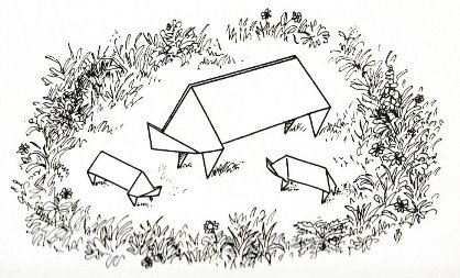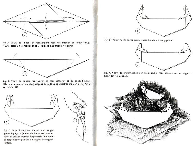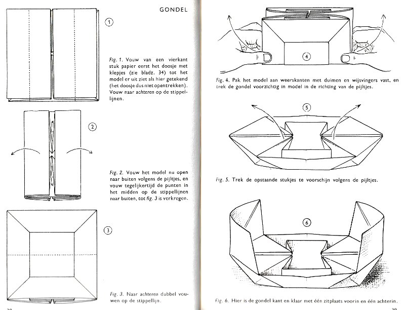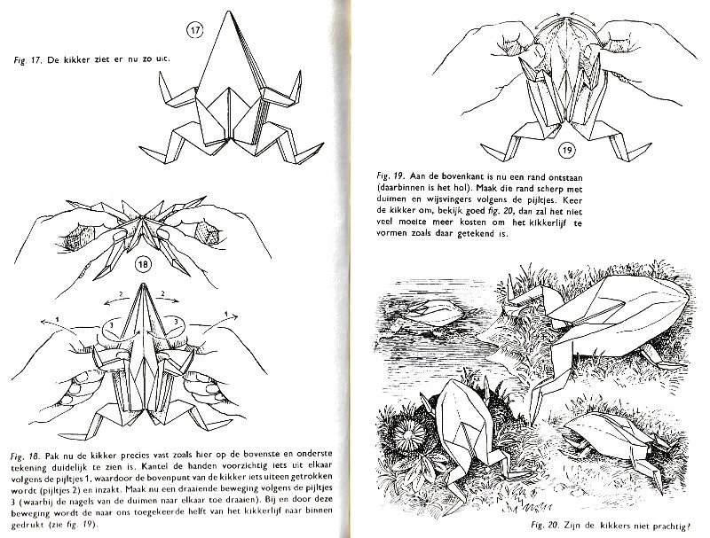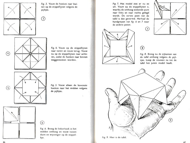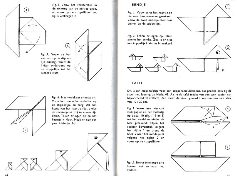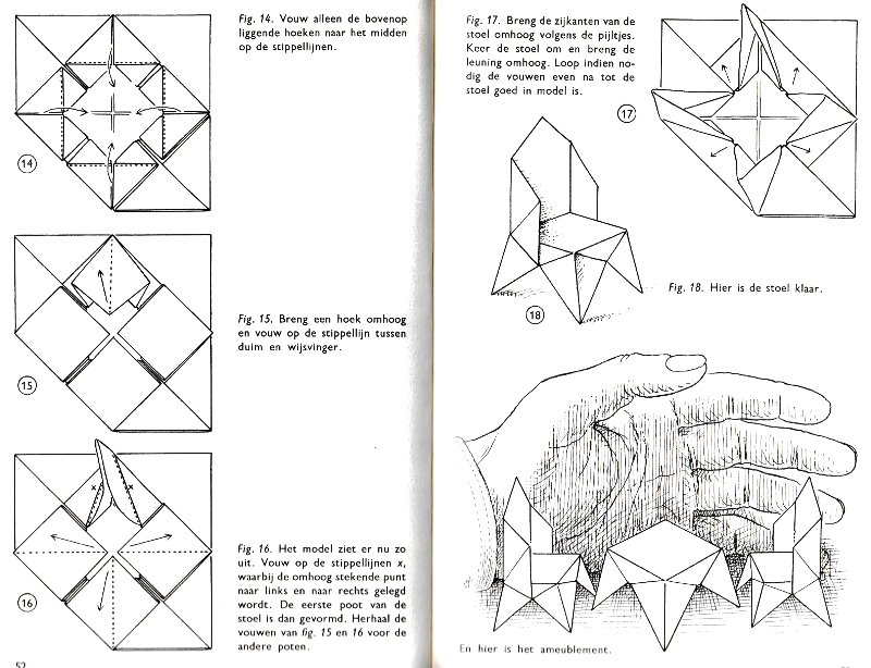 effectively a different work. In his Foreword the author says: 'About half of the book contains very old models, and the other half, as far as I know, are my own discoveries. These include tables, chairs, animals, boats, stars, and some decorations.' The author does not specifically label those designs which are his own invention, but since many of the designs are not previously known it seems logical to infer that these are the designs he is referring to. An English translation titled 'Paper Folding and Modelling' was published in 1965. A German translation titled 'Kempers Grosses Papierfaltbuch: Falten und gestalten' was published in 1965. A Spanish translation 'Origami: el arte del papel plegado' was published in 1972. **********