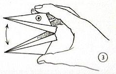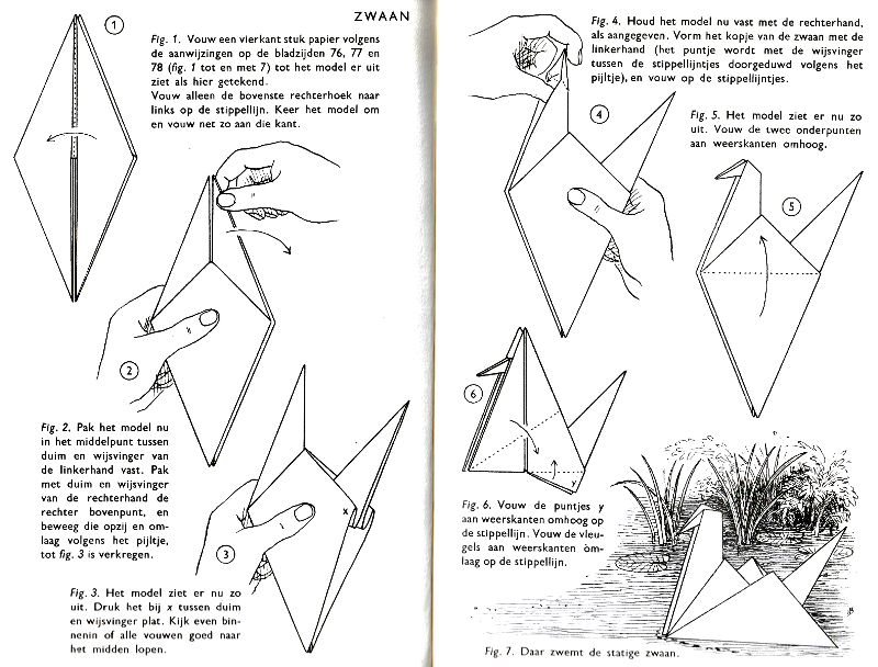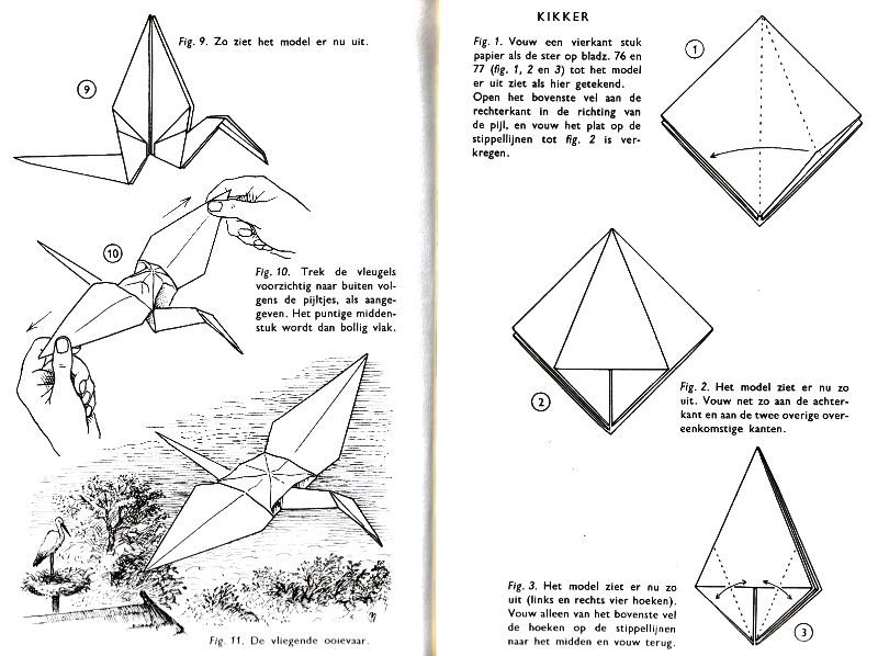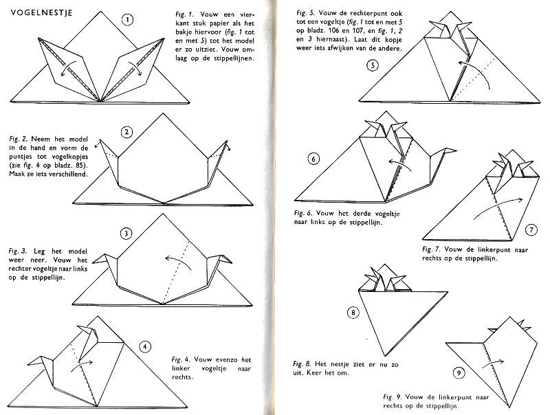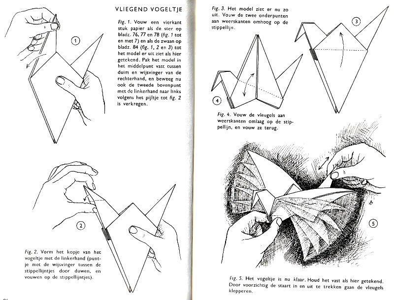 ********** Vliegend Volgeltje - The Flapping Bird In his Foreword the author says of this design: 'For the vibrant art of paperfolding (origami as the Japanese call it) we must travel to the Far East. The flying bird, perhaps the most beautiful folding pattern ever discovered, originated there. The way this ingenious pattern is folded has liberated the art of paperfolding from its seemingly limited possibilities and opened up new horizons, the end of which we will hopefully never see.
