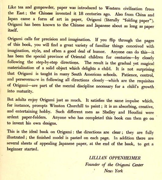 and by Museum Press Ltd of London in England. The author does not state whether the designs are traditional, his own original work, or the original work of some other designer. Several actual folded models were glued onto the pages. Lilian Oppenheimer wrote an Introduction to the work, which states:
