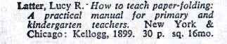 'How to Teach Paper-folding' by Lucy R Latter was published by Kellogg in New York and Chicago in 1899. ********** This work is mentioned in Gershon Legman's 'Bibliography of Paperfolding' which was published in 1952.