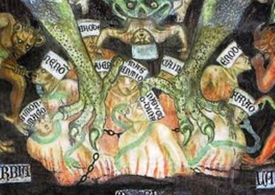 Tuscany, Italy in c1393. The design contains two types of written inscriptions to help explain the meaning of the painting. The main inscriptions give broad categories of sins, while subsidiary inscriptions explain the exact sins that individuals are being punished for e.g. sodomy. These subsidiary inscriptions are written on a very basic form of paper hat worn by the offenders, which are now commonly known as mitres of infamy. **********