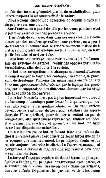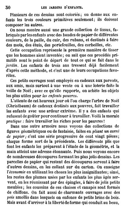 Roughly translated this reads: 'In another cupboard we see collections of geometrical or fancy figures, made by folding a square piece of paper. It is a progressive series of one hundred and twenty pieces. Each form emerges from the previous one. The various folds children make prepare them for the study of geometry and the hand achieves amazing dexterity.' Presumably this is a reference to Froebel's Schonheitsforman (Folds of Beauty). However, there is also a wonderfully clear statement of the ethos of Froebelian education as not just doing useful things (see page 34 reproduced below). A full copy of the work can be accessed here. **********