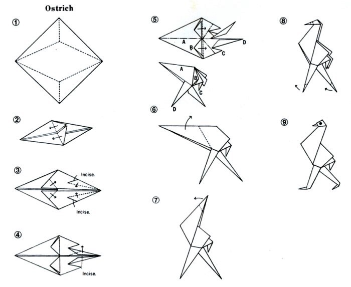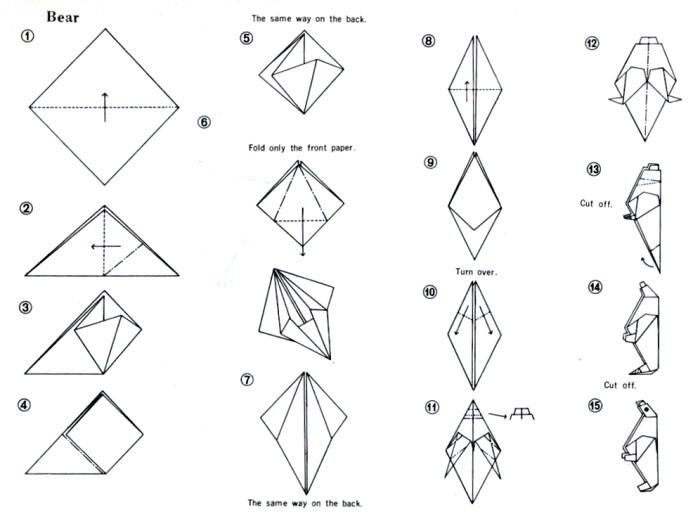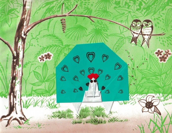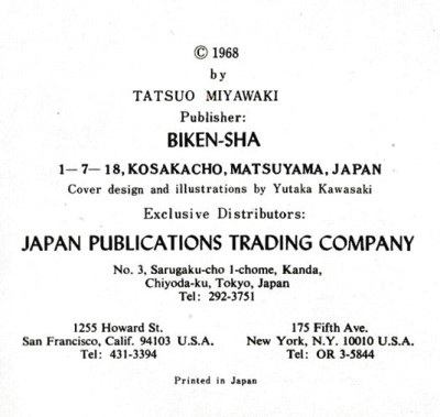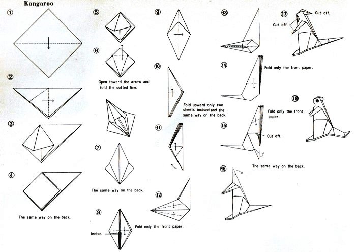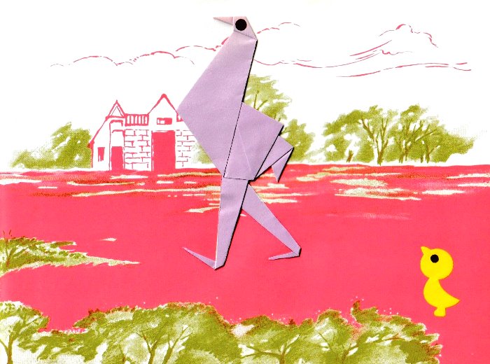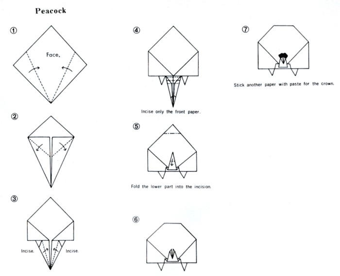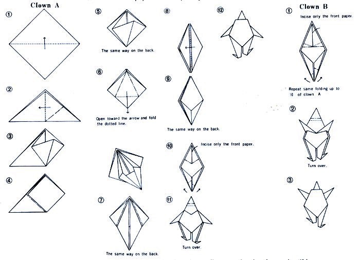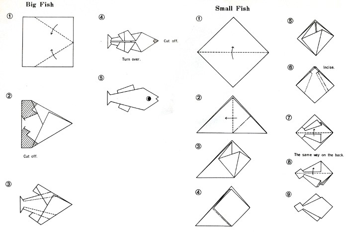 'Jolly Origami: Aquarium Book' by Tatsuo Miyawaki was published by Biken-Sha in Matsuyama, Japan in 1968 and distributed in the USA by Japan Publications Trading Company. The work contained folded examples of the designs and a pack of paper to fold with. Many of the designs are heavily cut and many are also depicted in the coloured plates with added decorations, especially eyes. My grateful thanks to the British Origami Society for letting me see a copy of this work. It is worth noting that many of the designs on the cover are not explained inside the work. **********