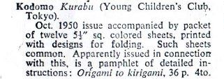 The issue of Kodomo Kurabu (Young Children's Club) for October 1950 contained a packet of 12 pre-printed sheets for folding. This work is mentioned in Gershon Legman's 'Bibliography of Paperfolding' which was published in 1952.