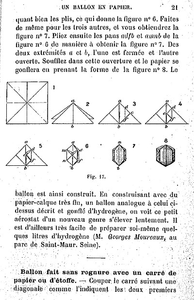 Previously published in 'Boite aux Lettres' of 9th July 1887. ********** Un ballon en papier - The Waterbomb The text suggests making this design from thin tracing paper and filling it with hydrogen to see it rise slowly.