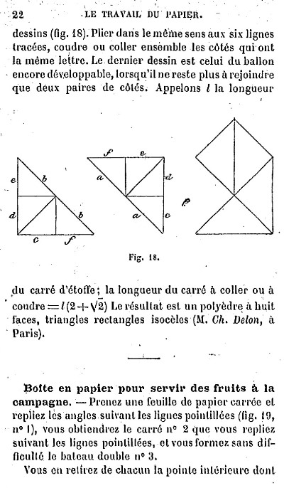 Previously published in 'Boite aux Lettres' of 20th October 1887. ********** Ballon fait sans rognure avec un carre de papier ou d'etoffe (Balloon made without offcuts from a sheet of paper or cloth) - The Cartonnage Silveroctahedron According to the text 'The result is an eight sided polyhedron', each side being a 'right isosceles triangle'.