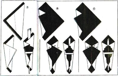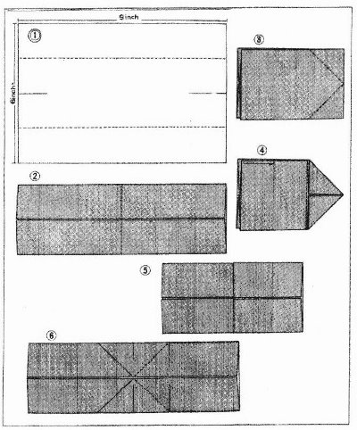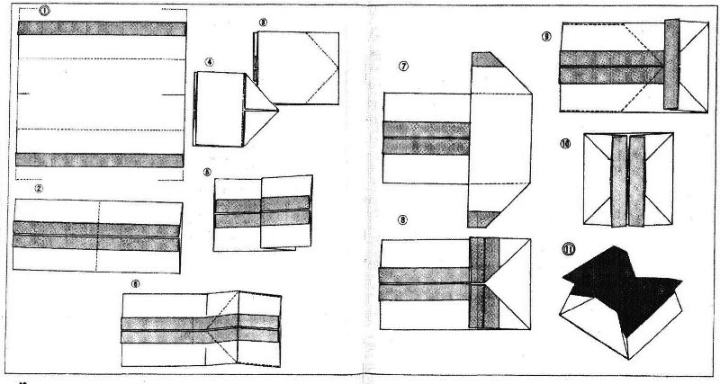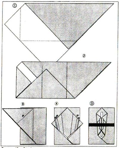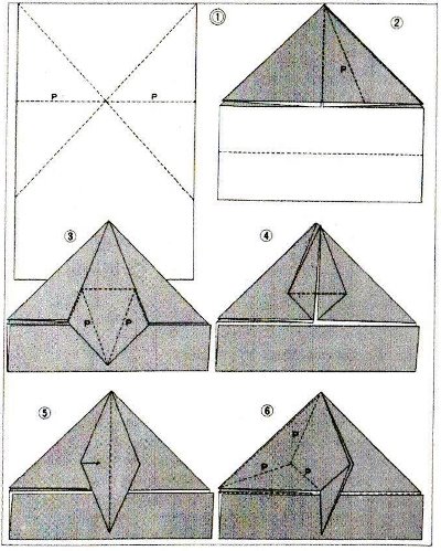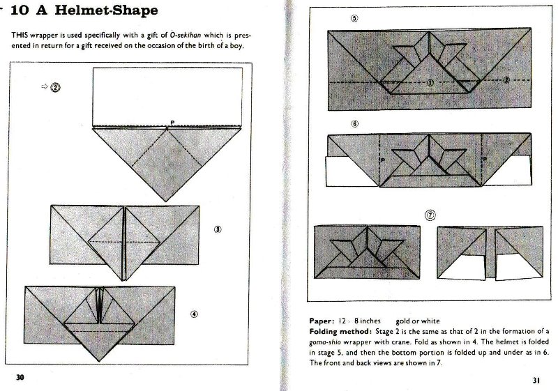 ********** A Helmet-Shape Wrapper Folded from a 12 x 8 (3 x 2) oblong of white or gold paper.