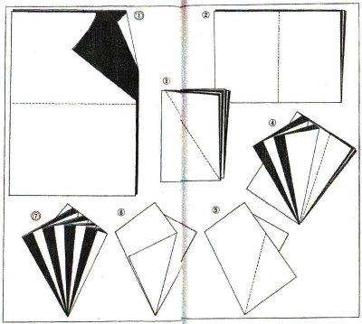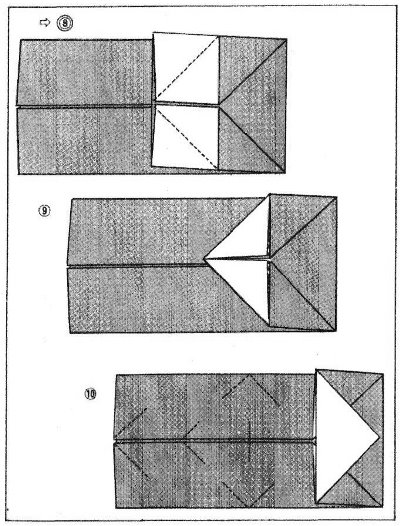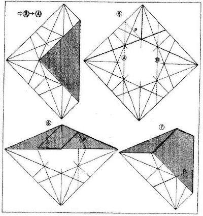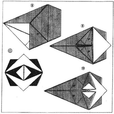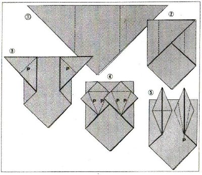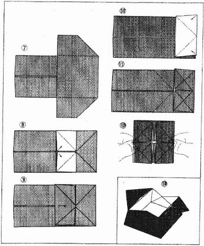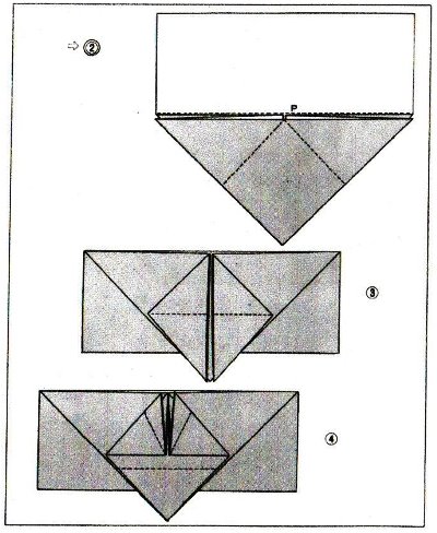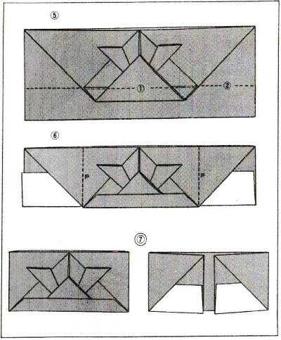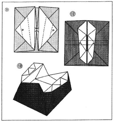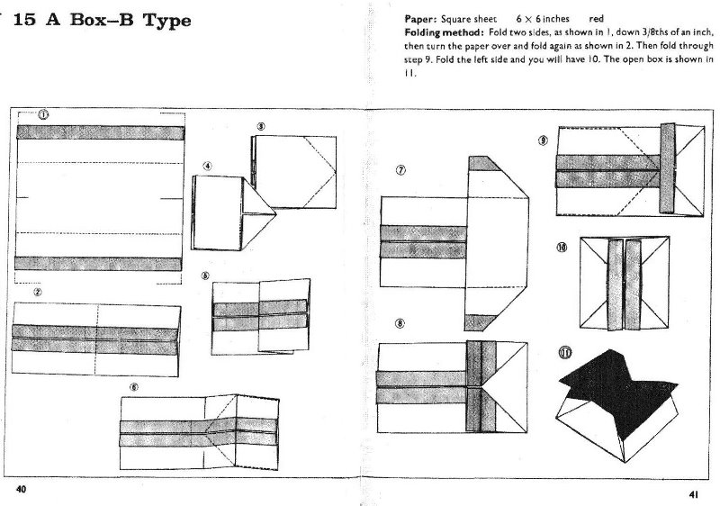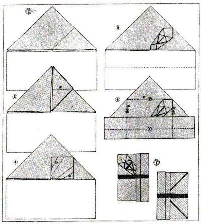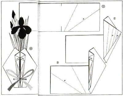 ********** At this point the author advances the theory that play origami developed from the folding of less formal containers (closed wrappers).