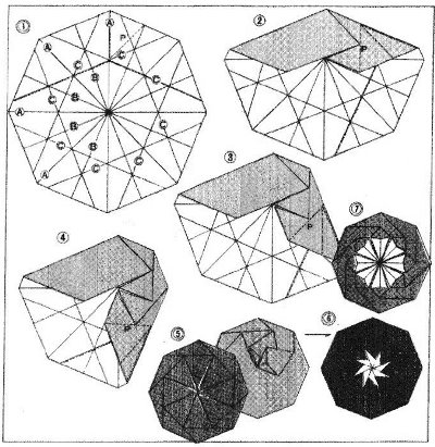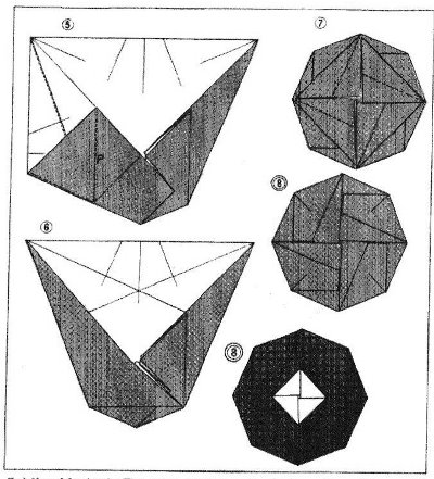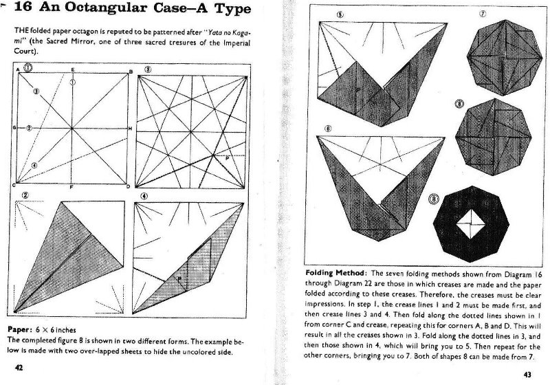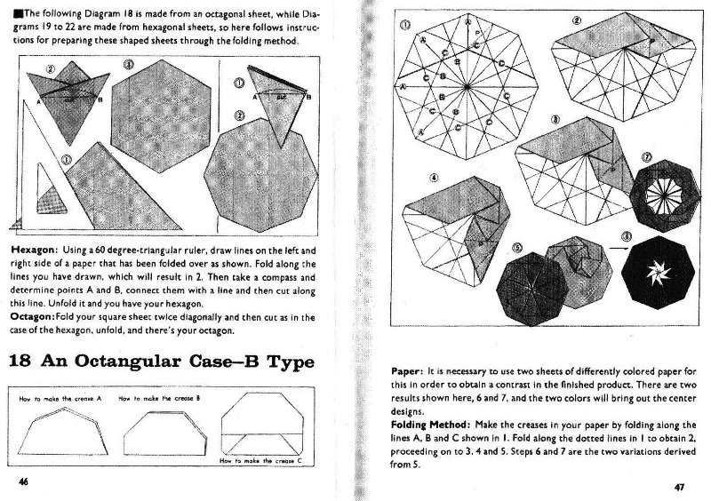 ********** An Octangular Case (Method B) Two decorative variations folded from octagons. Two sheets of paper are folded together to create the colour contrasts.