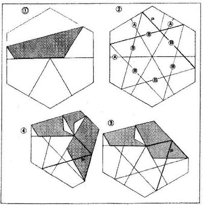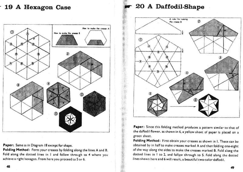 ********** A Daffodil Shape From a hexagon. The instructions say 'a yellow sheet of paper is placed on a green sheet'.