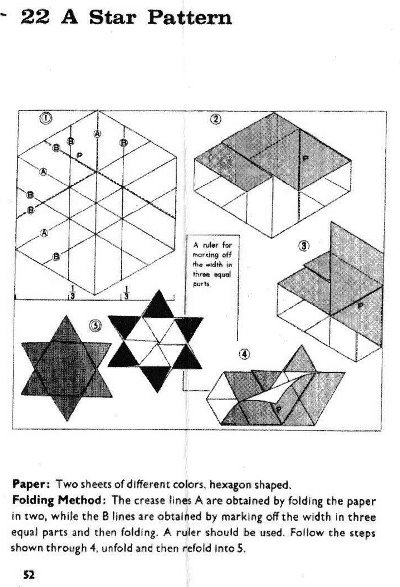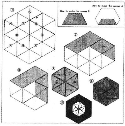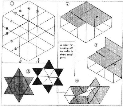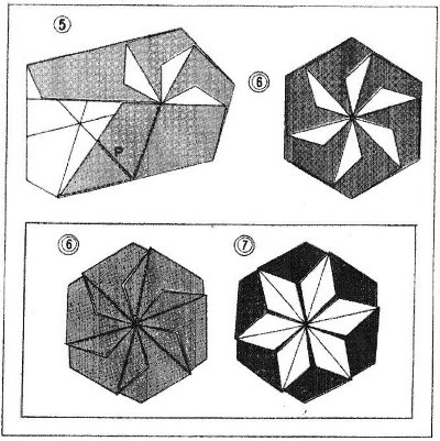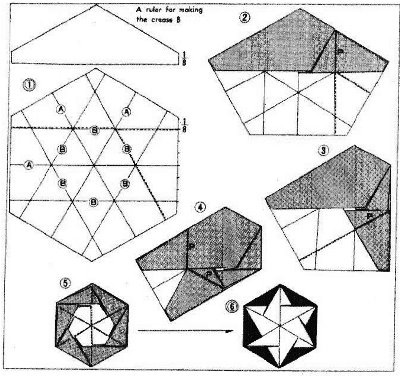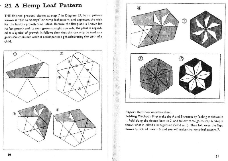 ********** A Hemp Leaf Pattern From a hexagon. The instructions say 'red sheet on white'.