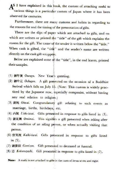 ********** Analysis The introductory pages (which can be read in full below) explain the nature of noshi, which consist of three parts, a strip of dried and stretched abalone, a folded paper wrapper to contain this strip, and a knotted string (mizuhiki) to hold the wrapper and the strip of dried and stretched abalone together. In modern practice the strip of dried and stretched abalone (noshita-awabi) is replaced by a strip of paper and the mizuhiki by a paper band. The author also states that noshi wrappers were originally folded from oblongs but are now usually folded from squares, and that the modern folding method has been simplified. ********** Three Noshi folded from squares The text states that these three modern noshi are each folded from two squares of paper, a red sheet inside a white one.