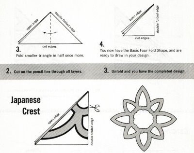 ********** In Western Europe and the Americas 1962 Two examles of fold and cut Japnese Family Crests appear in 'Kirigami: The Creative Art of Paper Cutting' by Florence Temko, which was published by Platt and Munk in New York in 1962.