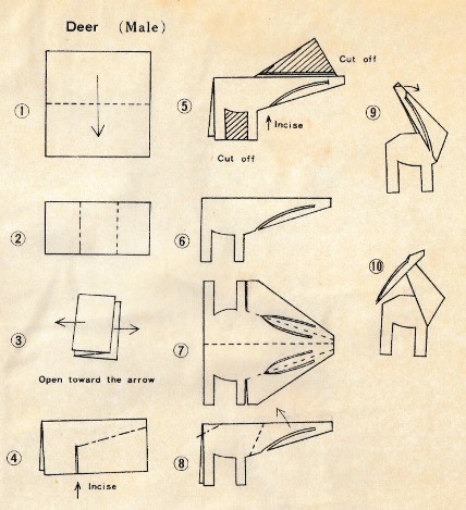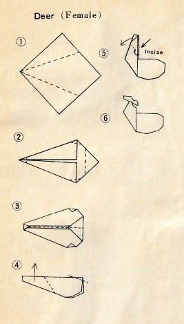 ********** 1960 A similar ompound design for a 'A Deer' appears in 'All About Origami' by Isao Honda, which was published by Toto Bunka Company, Limited in Tokyo in 1960. The horns are created using cuts.