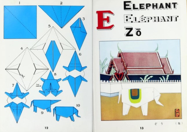********** 1951 A design for a three-legged elephant with an open back, folded from a bird base, appears in 'Origami to Kirinuki' by Saburo Ueda, which was published by Kokkado in Tokyo, most probably in 1951. The diagrams do not show how to obtain the tusks (which would require cuts).