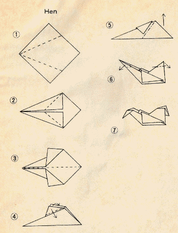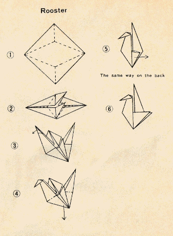 ********** 1960 Designs for a 'Hen' and 'Rooster' appear in 'Happy Origami: Whale Book' by Tatsuo Miyawaki, which was published by Biken-Sha in 1960. Hen