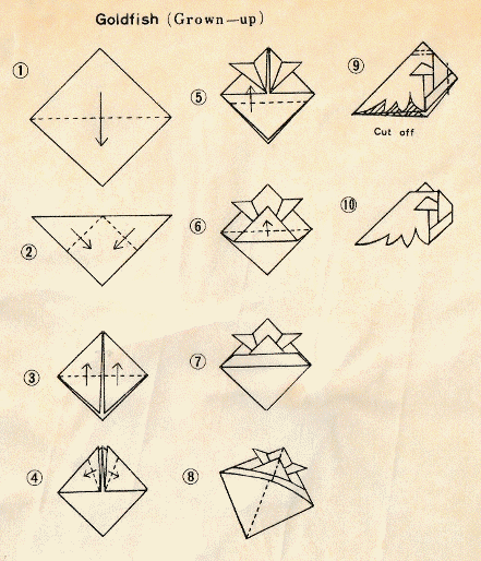 should be added. Thank you. In Isao Honda's book 'Nihon no kokoro dento origami', which was published by Japan Publications in Tokyo in 1969, the author says, roughly translated: 'This design is an application of a commonly known folding technique and was made in the early Taisho period (ie 1912 to 1926) as a kindergarten souvenir'. ********** In Japan (and in publications by Japanese authors) 1931 As far as I know the Cut Goldfish first appears in 'Origami (Part 1)' by Isao Honda, which was published in Japan in 1931. Two variatioins appear. Tahi (Seabream) and Goldfish (with an additional foldto straighten the body).