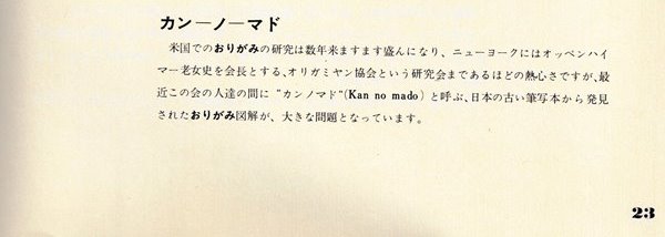 should be added. Thank you. ********** Introduction The Kan No Mado is a 63 page ms, written by Katsuyuki Adachi, and forming volume 223 of a much larger encyclopaedia which is owned by the Osaka Asahi newspaper in Japan and held in their library. The Kan No Mado comes from a section of the encyclopaedia entitled the Kayaragusa. The words Kan No Mado appear on the last page of the ms. They are not a title but more of an end note. For a possible interpretation of their meaning see entry for 1965 below. Even though Kan No Mado is not the original title of the work the usage is now well established and I have retained it on that basis. The alternative, to refer to the ms as Kayagarusa Volume 223, seems clumsy in comparison. The information on this page is not drawn from the original ms but from a facsimile of the Starr copy of the ms published by Julia and Martin Brossman in 1961 as 'A Japanese Paperfolding Classic'. The history of paperfolders' knowledge of this ms is interesting in itself. See Chronology below. ********** 1922 ********** 1934 According to Isao Honda, writing in his 'World of Origami' in 1965 (see below), a photoduplication of the Kan no mado was issued by the Library of Congress photoduplication service on Jukly 23rd 1934. Presumably it was issued to Isao Honda himself, although he does not say so. He does however state elsewhere in the same book that a photoduplication of the work is in his possession. I have not been able to verify thios information from any other source. ********** 1952 This work is mentioned in Gershon Legman's 'Bibliography of Paperfolding' which was published in 1952.
