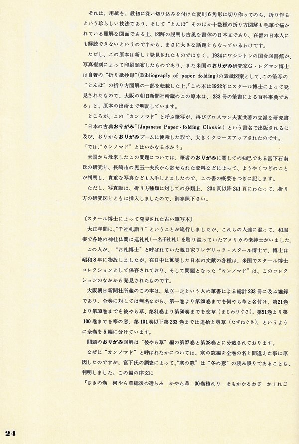 ********** 1969 There is also a section offering information about the Kan no mado in Isao Honda's book 'Nihon no Kokoro Dento Origami'. Inter alia this section says, roughly translated: 'Origami is becoming increasingly popular in the world, and there is so much enthusiasm that there is even a research group in New York called the Origami Society, whose members include Mrs Oppenheimer. Recently, however, a type of origami called Kan no mado, which has been discovered in old Japanese manuscripts, has become a major issue among members of this group. It is a technique that apparently first involves cutting the paper into an irregular hexagon with deep slits, then folding it, and the diagrams illustrating over a dozen folding methods, including the 'tomba' type, are drawn in calligraphy and are extremely incomprehensible. Not only that, the explanations of the diagrams are written in old-fashioned Japanese, and even Japanese people living in Japan are unable to decipher them ...' 'During the Taisho era the 'Seshafuda Dance' became popular, and among these people was an elderly American gentleman, dressed in traditional Japanese clothing, who would travel around the country pasting pilgrimage tags ... at shrines and temples. This man was Dr Frederick Starr, a Japanophile known as the 'Banknote Doctor'. He passed away in 1933, but the various Japanese documents he collected during his time in Japan are preserved in the United States ... and the 'Kan no mado' was discovered within this collection.'