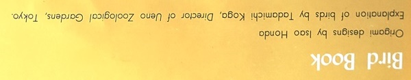 'Origami Zoo: Bird Book' by Isao Honda was published by Toto Shuppan Co. Ltd in 1961 and distributed by Japan Publications Trading Company. It is a large format book published Japanese-style in a cardboard sleeve. The early pages in the book are decorated with folded paper models, the later pages contain the diagrams. Ther details on this page are taken from a copy of the work kindly lent to me by the British Origami Society. Note that the title page states 'Origami designs by Isao Honda'. **********