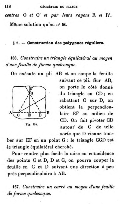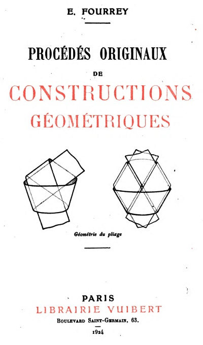'Procedes originaux de constructions geometriques' by Emile Fourrey was published by Librairie Vuibert in Paris in 1924. It contains a section on the mathematics of paperfolding. ********** This work is mentioned in Gershon Legman's 'Bibliography of Paperfolding' which was published in 1952.