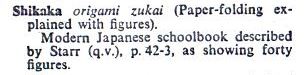 'Shikaka Origami Dzukai' is mentioned in 'The Art of Paper Folding in Japan', a magazine article written by Frederick Starr and published in the issue of the tourist magazine 'Japan' for October 1922. Starr writes about a box of 24 paperfolds folded for him by a seven year old girl. The list of designs is interesting because of its early date. Later on in the article Starr says that all the designs can be found in the book 'shikaka origami dzukai'.