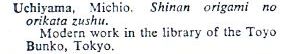 'Shin'an Origami Orikata Zukai' (New Origami Folding Diagrams) by Michio Uchiyama was published in 1935. This work is mentioned in Gershon Legman's 'Bibliography of Paperfolding' which was published in 1952.
