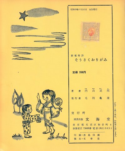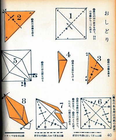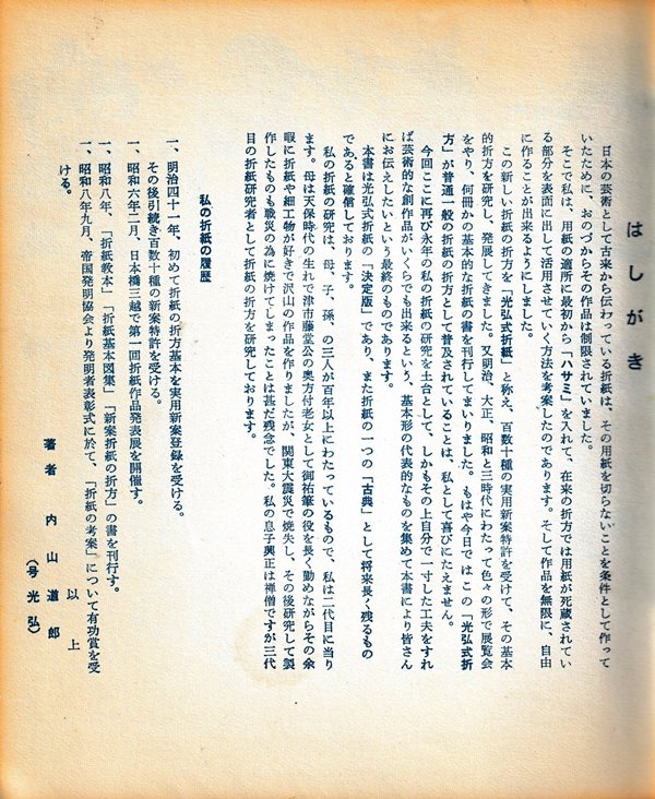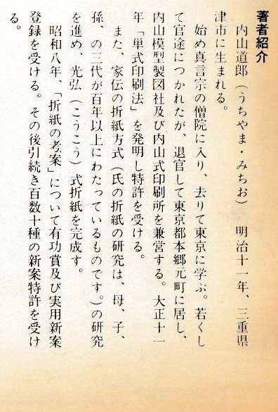********** About the author Roughly translated the notes on the dust jacket say: 'Micvhio Uchiyama was born in Tsu City, Mie Prefecture, in 1878. He first entered a Shingon Buddhist monastery, then left to study in Tokyo. He entered government service at a young age but, after retiring, he moved to Hongo Motomachi, Tokyo, where he ran the Uchiyama Model Drawing Company and the Uchiyama Printing Company. In 1922 he invented the 'single entry printing method' and received a patent for it. He also continued his reearch into the family origami method (his research into origami has spanned over 100 years, through three generations of mother, son and grandson) and perfected the Koko style of origami. In 1933 he received an award for his 'Origami inventions' and a utility model registration. He subsequently received over 100 patents for new inventions.'