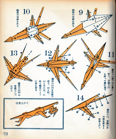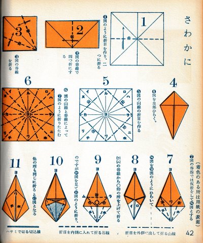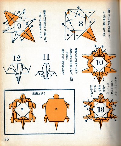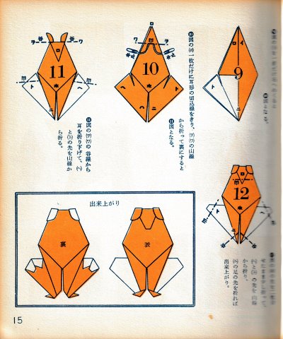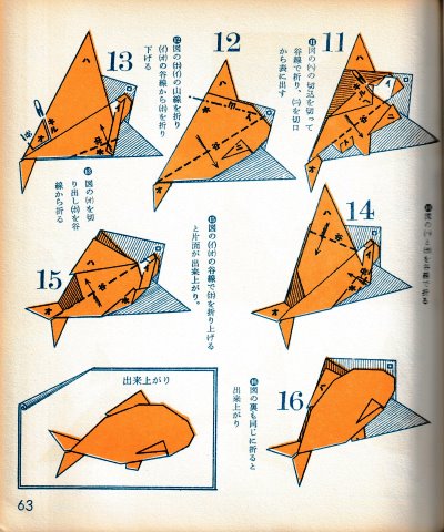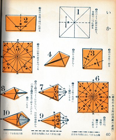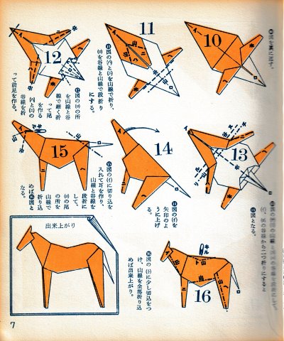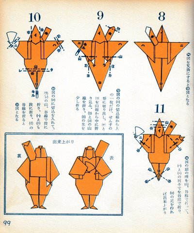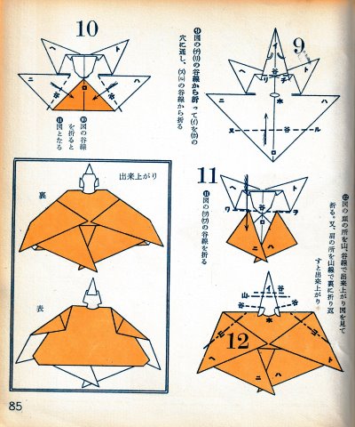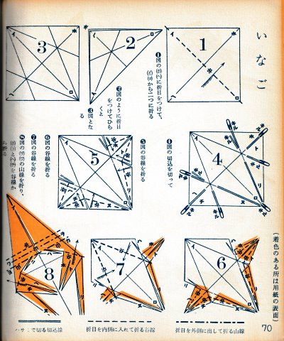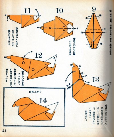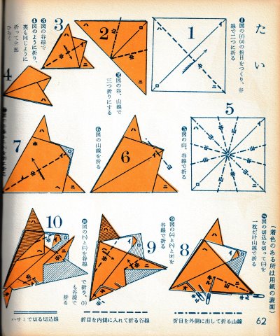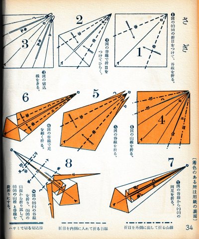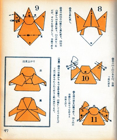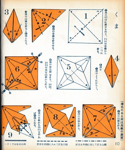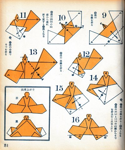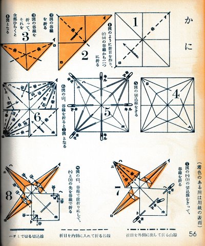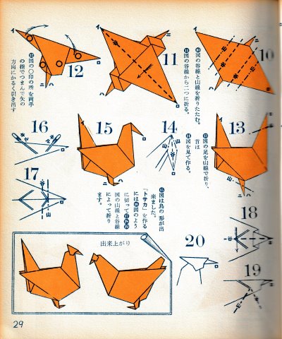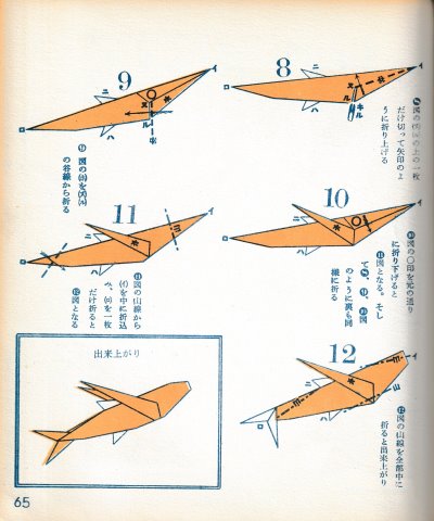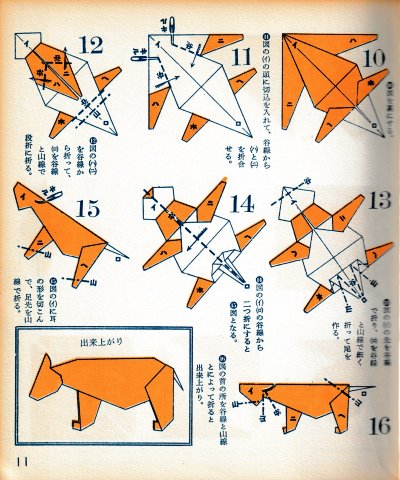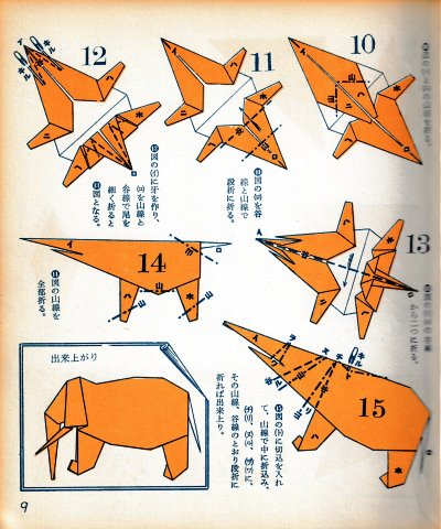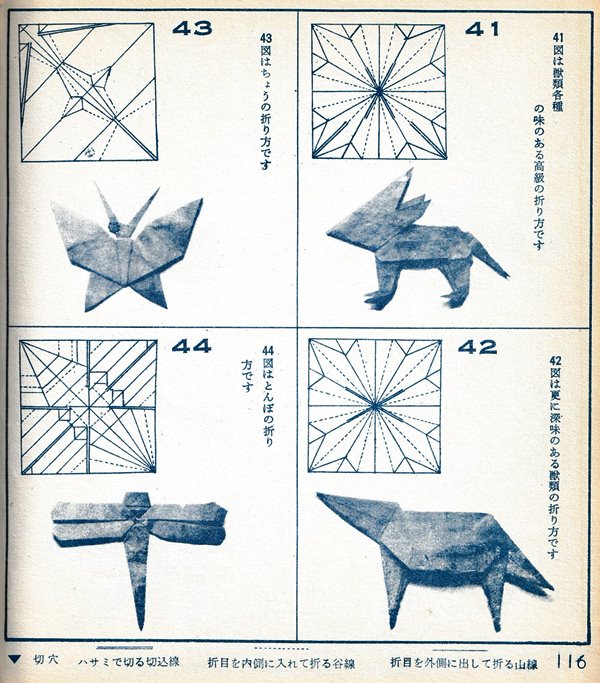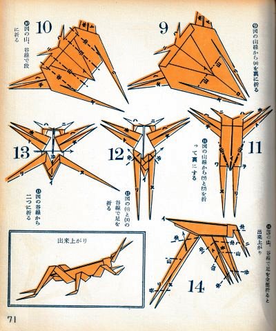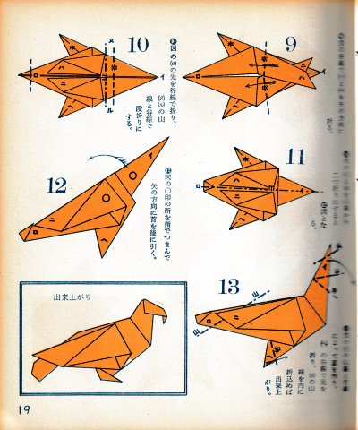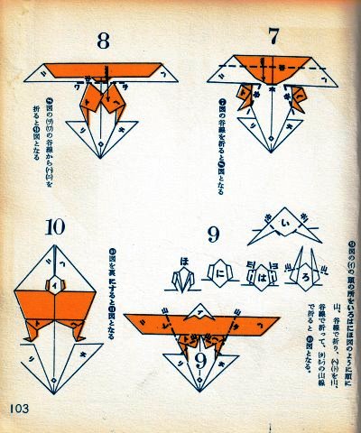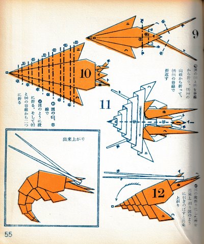 ********** The Basic Shapes of Mitsuhiro-style Origami Roughly translated this passage reads: 'The basic shapes compiled here are a selection of 60 representative basic folding shapes and serve as a sort of 'cheat sheet' that shows readers which basic shapes to rely on when making their own original origami. As examples, we have included photographs of examples of works that can be made from each basicv shape. These can be made quickly, which is (a quality) unique to these basic shapes. Of course, many other works can be created from each basic form, but these are merely hints and left for you to use in your own ingenuity. The key is to find ways to bring unused paper to the surface and to make use of it. The order of arrangement of these basic shapes is people, animals, birds, insects and fish. All of the sheets are square, but by applying the shape of the ppaper to shapes such as rectangles, triangles, pentagons, octagons, hexagons and circlesm and by using the original divisions as shown in the illustrations, it is possible to creat an infinite number of new works. Due to space limitation, I cannot provide a co,prehensive explanation of the ten, twelve and sixteen folds, but if you use a protractor to establish these you will find the basic shapes surprisingly easy to create. If you apply this to the basics of folding you can create a more sophisticated basic form and a work of art with a rich flavour.