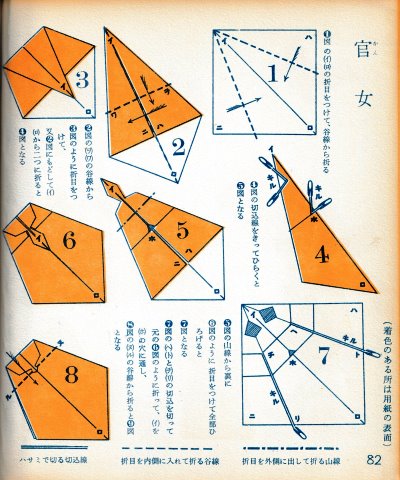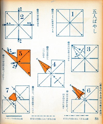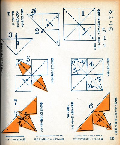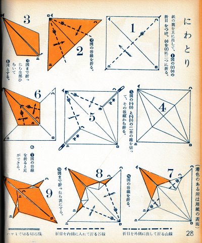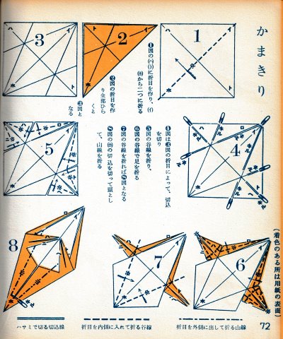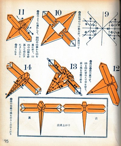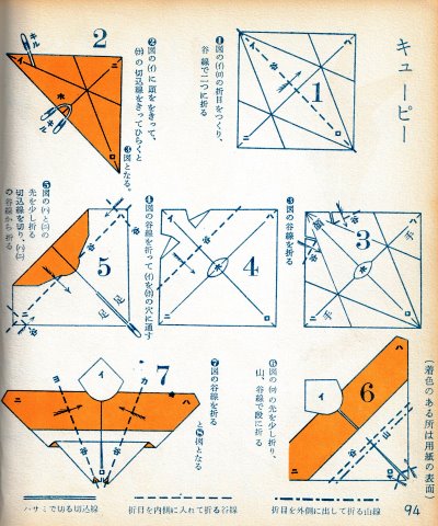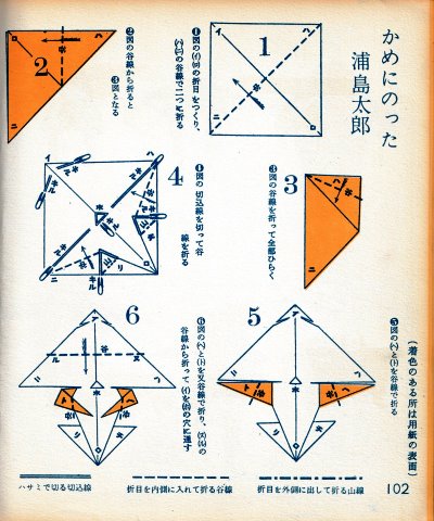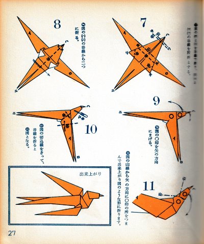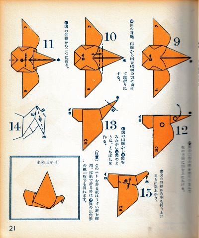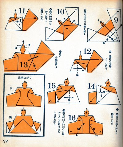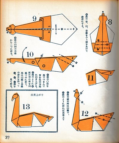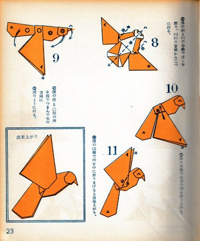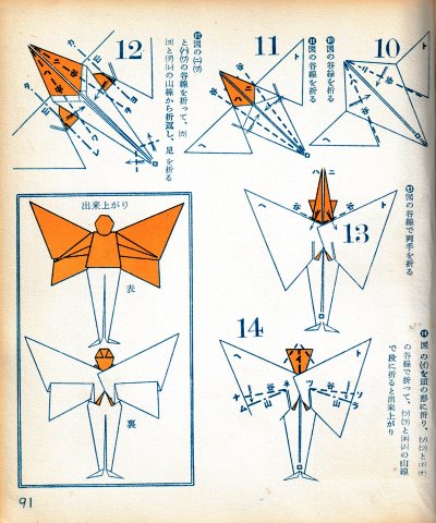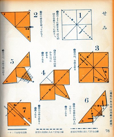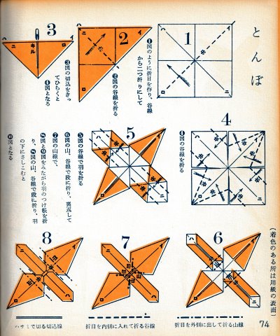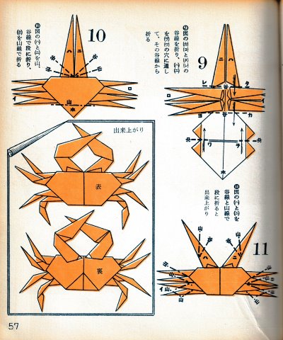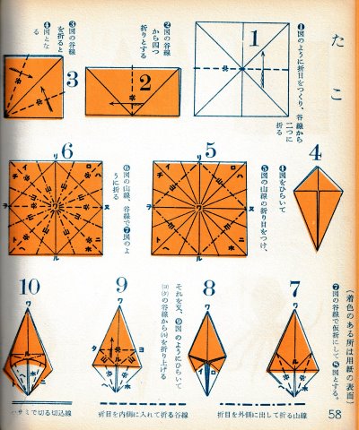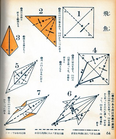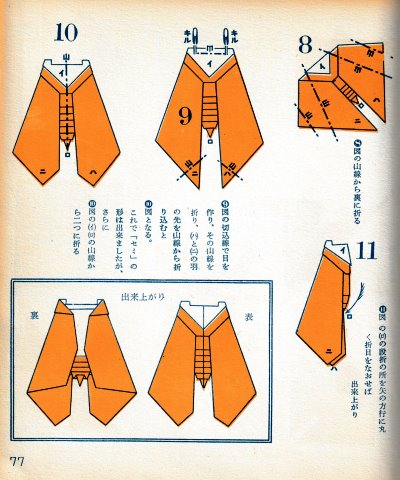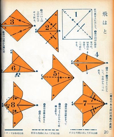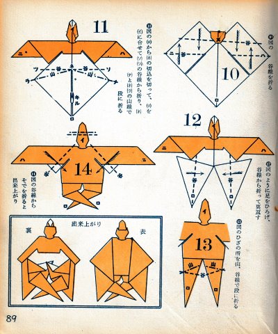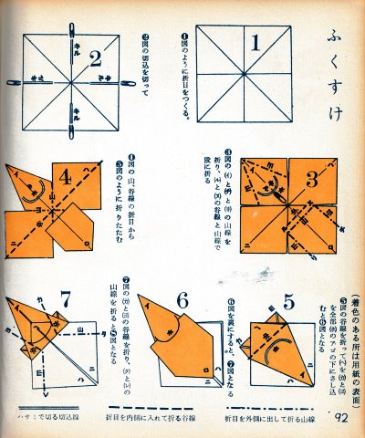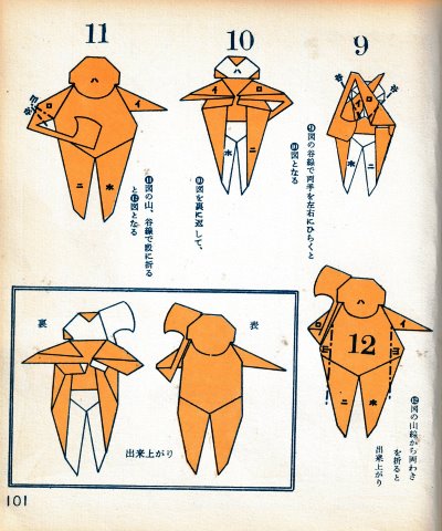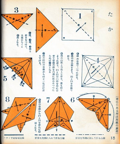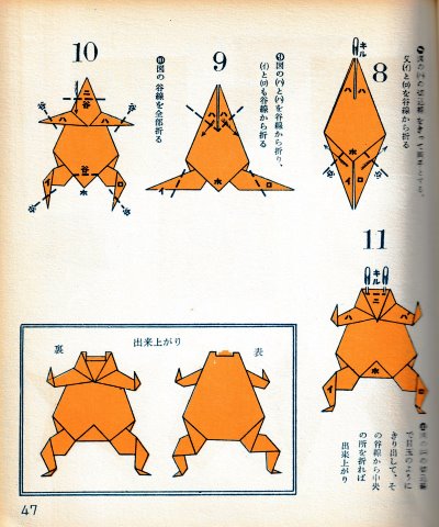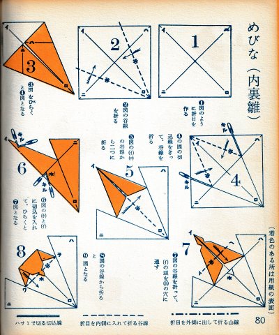 ********** The Basic Shapes of Mitsuhiro-style Origami Roughly translated this passage reads: 'The basic shapes compiled here are a selection of 60 representative basic folding shapes and serve as a sort of 'cheat sheet' that shows readers which basic shapes to rely on when making their own original origami. As examples, we have included photographs of examples of works that can be made from each basicv shape. These can be made quickly, which is (a quality) unique to these basic shapes. Of course, many other works can be created from each basic form, but these are merely hints and left for you to use in your own ingenuity. The key is to find ways to bring unused paper to the surface and to make use of it. The order of arrangement of these basic shapes is people, animals, birds, insects and fish. All of the sheets are square, but by applying the shape of the ppaper to shapes such as rectangles, triangles, pentagons, octagons, hexagons and circlesm and by using the original divisions as shown in the illustrations, it is possible to creat an infinite number of new works. Due to space limitation, I cannot provide a co,prehensive explanation of the ten, twelve and sixteen folds, but if you use a protractor to establish these you will find the basic shapes surprisingly easy to create. If you apply this to the basics of folding you can create a more sophisticated basic form and a work of art with a rich flavour.