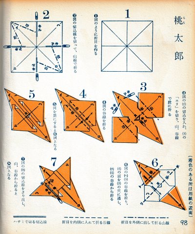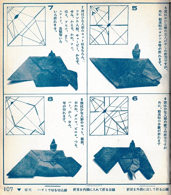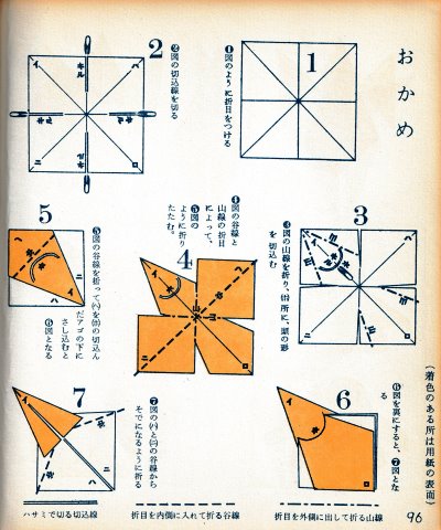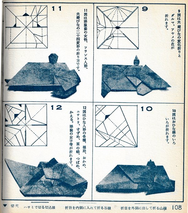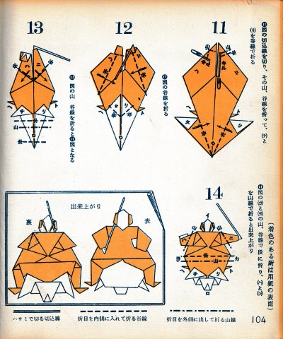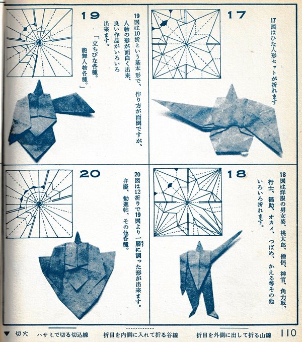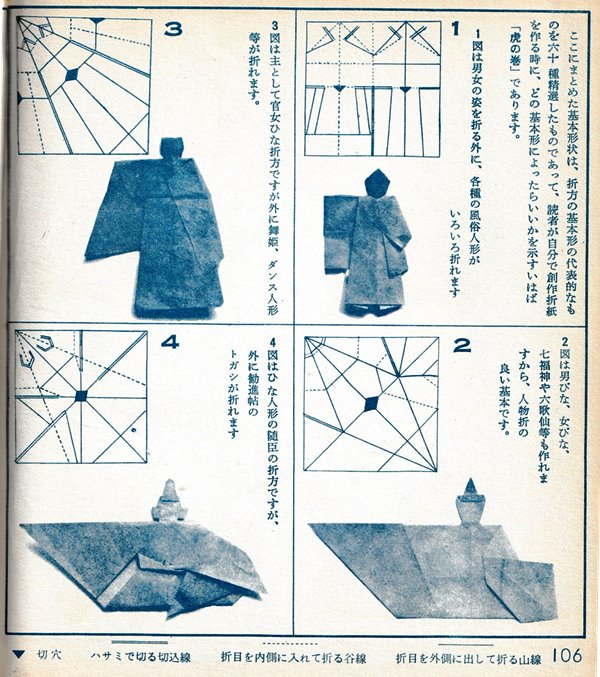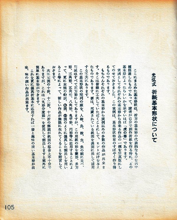 ********** Preface Roughly translated this Preface reads: 'Origami, a traditional Japanese art passed down since ancient times, was created under the condition that the paper should not be cut, which naturally limited the types of work that could be created. So I came up with a method to cut the paper in the right places from the beginning, bringing to the surface those parts of the paper that would go unused in traditional folding methods, and making them usable. This allows you to create works with limitless freedom. This new origami method was named 'Mitsuhiro-style origami', and after receiving hundreds of utility model patents, the basic method was researched and developed. Various exhibitions were held over the three eras of meiji, Taisho and Showa, and several books on basic origami were published. It gives me great joy that today 'Mitsuhiro-style origami' has become a standard , common origami technique. This time, based on my many years of research into origami, I have once again collected some representative basic forms that , with a little ingenuity, can be used to create any number of artistic creations, and I would like to share these with you in this final book. This book is the definitive work about 'Mitsuhiro-style origami' and I am confident that it will remain a classic of origami for many years to come. My research into origami has been passed down through three generations - mother, son, and grandson - for over 100 years. I am the second generation. My mother was born in the Tenpo era and served for many years as a maid to Lord Todo of Tsu City. She loved origami and handicrafts, creating many pieces in her spare time. However, they were burned in the Great Kanto Earthquake, and it was a great shame that the beautiful works she researched and created afterwards were also burned in an ocupational accident. My son, Okumasa, is a Zen monk, but he is also the third generation of origami reserachers, studying the art of folding origami. My origami history: In 1908 the basic method of folding origami was registered as a utility model for the first time. I subsequently received over 100 new invention patents. In February 1931 I held my first exhibition of origami works at Mitsubishi Department Store in Nihonbashi. In 1933 I published the books 'Origami Textbook', 'Origami Basic Diagram Collection' and 'New Origami Folding Methods'. In September 1933 I received the Merit Award for 'Origami Invention' from the Imperial Institute of Invention at the awards ceremony for inventors.'