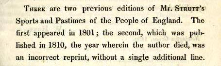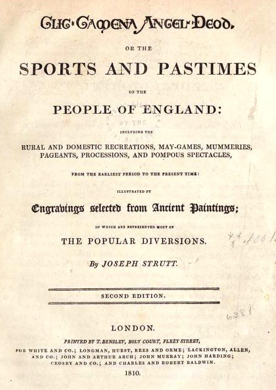 'Glig-Gamena Angel-Deod or The Sports and Pastimes of the People of England' by Joseph Strutt was published in London in 1801. This page is based upon the 2nd edition of 1810, which, however, I believe was identical to the first in all material respects. A new edition of the work, edited by William Hone, was published in 1930. The 'Advertisement' (ie Introduction) says: