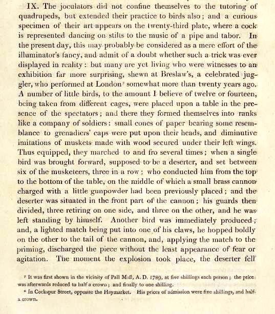 ********** Analysis This book contains two sections of some minor interest to the paperfolding historian: Paper Hats This section describes 'small cones of paper bearing some resemblance to grenadiers' caps' being placed on the heads of performing birds. It is not clear from the description whether these were simply paper cones or some other form of folded paper hat.