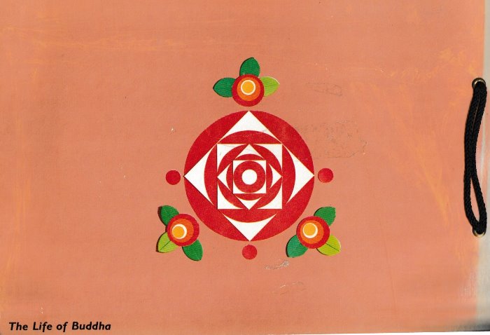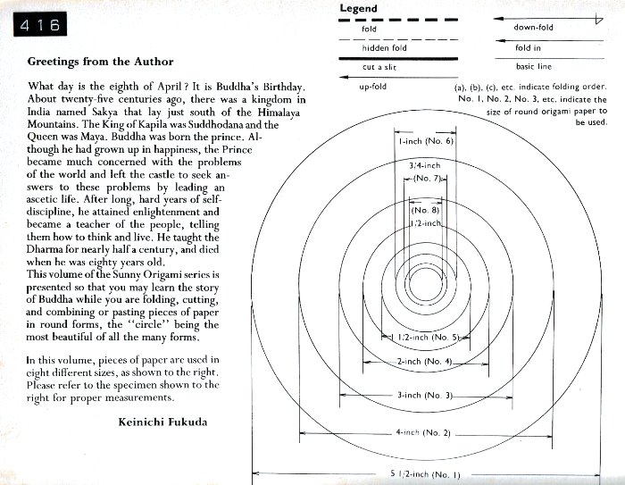 'Sunny Origami: The Life of Buddha' by Keinichi Fukuda was published by Jomo Kagaku Kogyosha in Japan in 1968 and distributed by Japan Publications Trading Company. The work is one in a series of 10 works by the same author. Details of the other works in the series can be found on the page about the earliest of the works, 'Sunny Origami: Angel Book'. All these books are of a similar format and explain ways of making designs by combining simple pictorial elements, made from folded, and often cut, paper circles of varying sizes, into multipiece collages.These books do not use standard origami diagrams, but, instead, contain a folded exemplar of each design together with a simple explanation of how each of the pieces that make up the design is to be folded / cut. My grateful thanks to the British Origami Society for letting me see a copy of this work. **********
