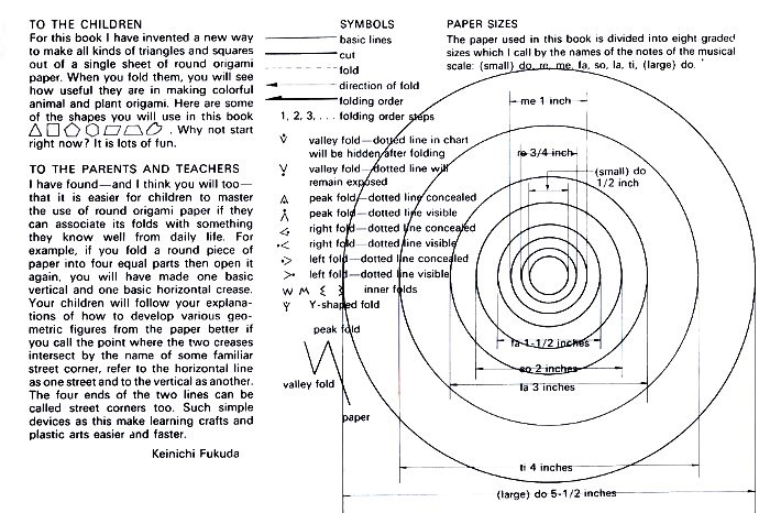 'Sunny Origami: Lion Book' by Keinichi Fukuda was published by Jomo Kagaku Kogyosha in Japan in 1970 and distributed by Japan Publications Trading Company. The work is one in a series of 10 works by the same author. Details of the other works in the series can be found on the page about the earliest of the works, 'Sunny Origami: Angel Book'. All these books are of a similar format and explain ways of making designs by combining simple pictorial elements, made from folded, and often cut, paper circles of varying sizes, into multipiece collages.These books do not use standard origami diagrams, but, instead, contain a folded exemplar of each design together with a simple explanation of how each of the pieces that make up the design is to be folded / cut. My grateful thanks to the British Origami Society for letting me see a copy of this work. **********