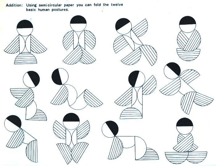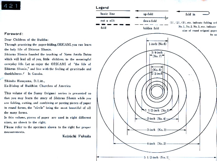 'Sunny Origami: The Life of Shinran Shonin' by Keinichi Fukuda was published by Jomo Kagaku Kogyosha in Japan in 1969 and distributed by Japan Publications Trading Company. The work is one in a series of 10 works by the same author. Details of the other works in the series can be found on the page about the earliest of the works, 'Sunny Origami: Angel Book'. All these books are of a similar format and explain ways of making designs by combining simple pictorial elements, made from folded, and often cut, paper circles of varying sizes, into multipiece collages.These books do not use standard origami diagrams, but, instead, contain a folded exemplar of each design together with a simple explanation of how each of the pieces that make up the design is to be folded / cut. My grateful thanks to the British Origami Society for letting me see a copy of this work. **********