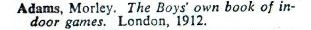 'The Boy's Own Book of Indoor Games and Recreations. by Morley Adams was published by The Religious Tract Society in London in 1912. ********** This work is mentioned in Gershon Legman's 'Bibliography of Paperfolding' which was published in 1952.