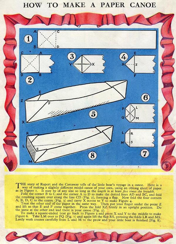 'The New Rupert' was published by The Daily Express in 1954. It contains: A story titled 'Rupert and the Friendly Sea-Lion' and accompanying folding instructions 'How to Make a Paper Sea-Lion and Penguin' (The Fish Base Seal and The Fish Base Penguin - both in cut versions) A story titled 'Rupert and the Castaway' and accompanying folding instructions 'How to Make a Paper Canoe' (The Blunt-Ended Boat and a Canoe i.e. a non-blunt-ended version). **********