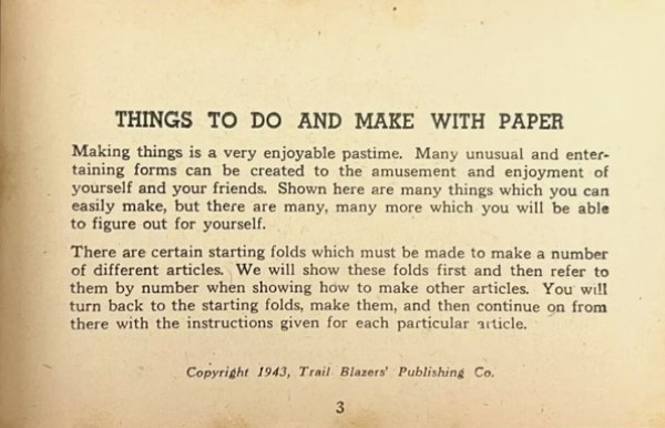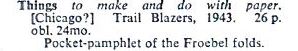 'Things to Make and Do with Paper' was published by Trail Blazers' Publishing Company in 1943. This work is mentioned in Gershon Legman's 'Bibliography of Paperfolding', which was published in 1952, and suggests that it may have been published in Chicago.