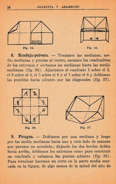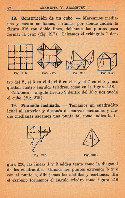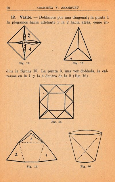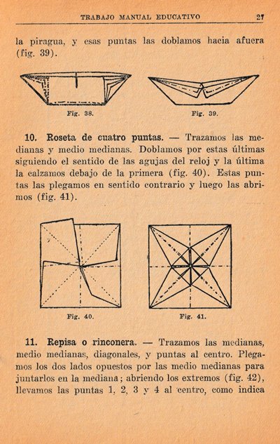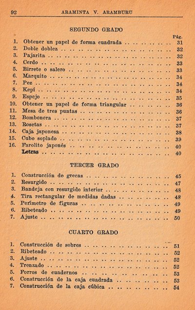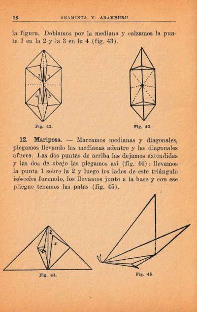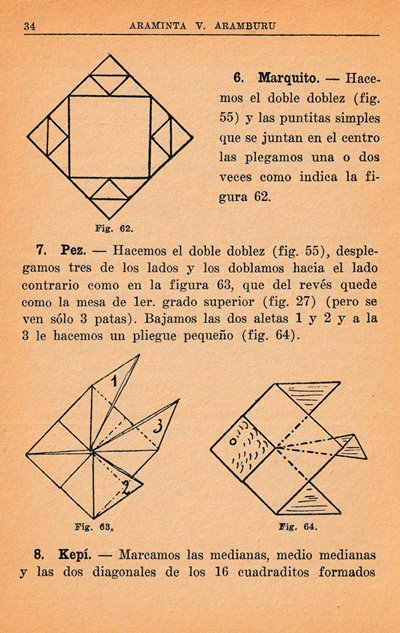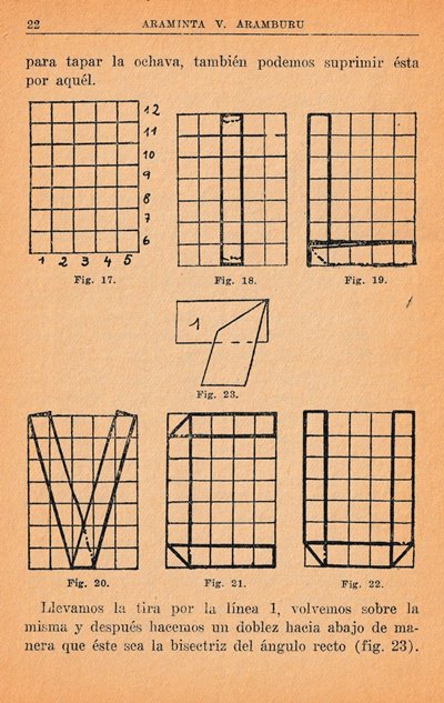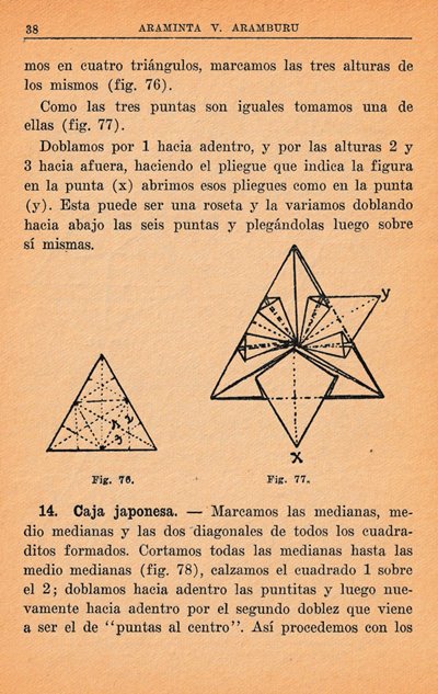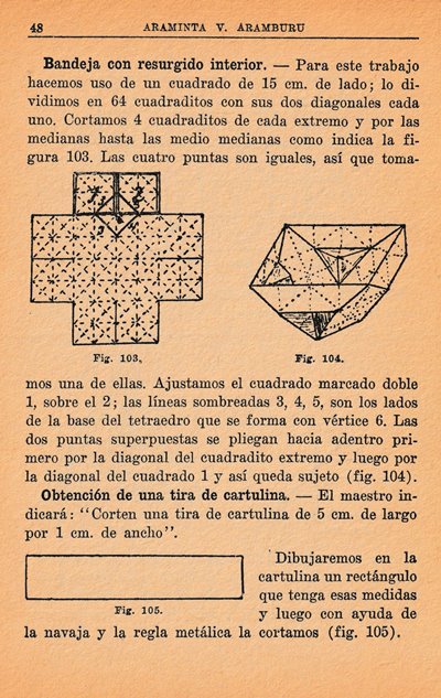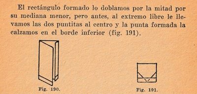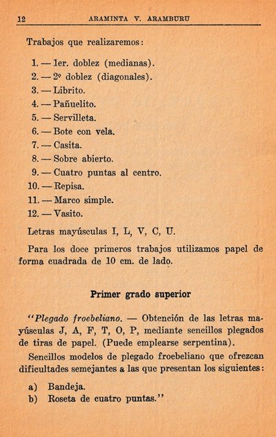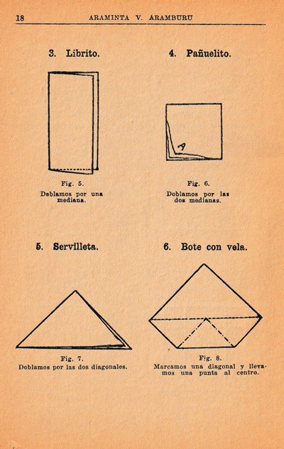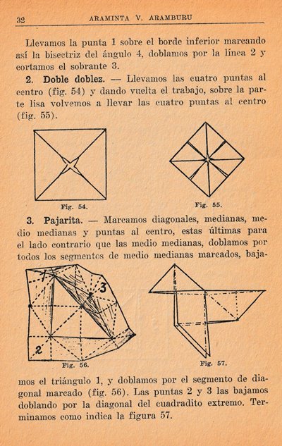 'Trabajo Manual Educativo' by Araminta V Aramburu was published by F Crespillo in Buenos Aires. The work is undated. However, a publication date of 1939 is given in the bibliography in 'Papirolas - Volume 3' by Vicente Solorzano Sagredo, which was published in Buenos Aires in 1940. This page is based on a copy of the work gifted to Robert Harbin by Ligia Montoya and currently held in the library of the British Origami Society, who have kindly allowed me access to it. ********** The work is mentioned in Gershon Legman's 'Bibliography of Paperfolding':