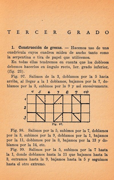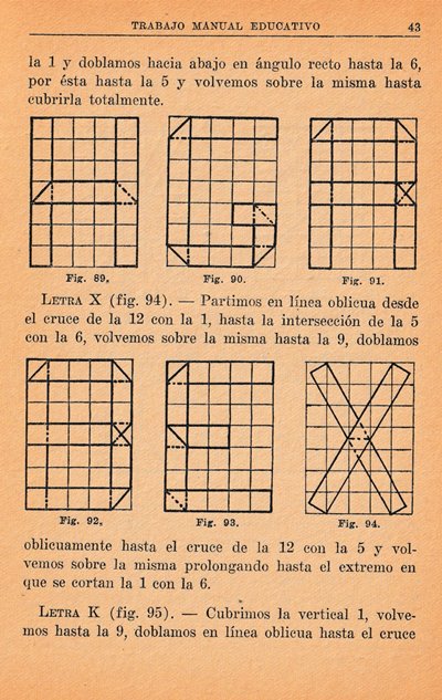 ********** Analysis ********** Designs Folded from Paper Strips Letras Mayusculas - Paper Alphabets The material for Grades 1 and 2 includes instructions showing how to fold various letters of the alphabet from paper strips. Grade 1 - - The letters I, L, V ,C and U Grade 2 - Letras Mayusculas - The letters N, M, W, Z, D, Q, H, G, R, B, E, X, K, Y In the later grades the letters are drawn rather than folded. ********** Constuccion de grecas - Folding of strips into Greek Key patterns