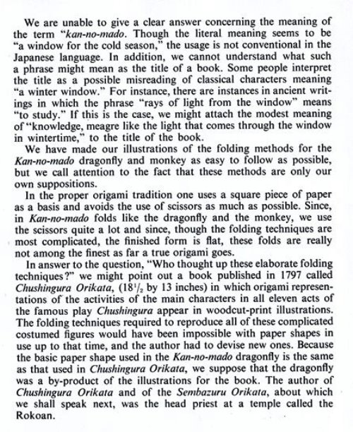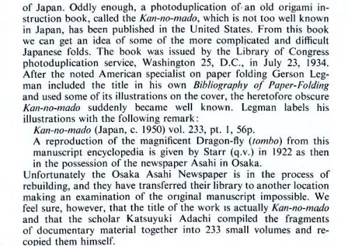 should be added. Thank you. ********** Introduction The Kan No Mado is a 63 page ms, written by Katsuyuki Adachi, and forming volume 223 of a much larger encyclopaedia which is owned by the Osaka Asahi newspaper in Japan and held in their library. The Kan No Mado comes from a section of the encyclopaedia entitled the Kayaragusa. The words Kan No Mado appear on the last page of the ms. They are not a title but more of an end note. For a possible interpretation of their meaning see entry for 1965 below. Even though Kan No Mado is not the original title of the work the usage is now well established and I have retained it on that basis. The alternative, to refer to the ms as Kayagarusa Volume 223, seems clumsy in comparison. The information on this page is not drawn from the original ms but from a facsimile of the Starr copy of the ms published by Julia and Martin Brossman in 1961 as 'A Japanese Paperfolding Classic'. The history of paperfolders' knowledge of this ms is interesting in itself. See Chronology below. ********** 1922 ********** 1934 According to Isao Honda, writing in his 'World of Origami' in 1965 (see below), a photoduplication of the Kan no mado was issued by the Library of Congress photoduplication service on Jukly 23rd 1934. Presumably it was issued to Isao Honda himself, although he does not say so. He does however state elsewhere in the same book that a photoduplication of the work is in his possession. I have not been able to verify thios information from any other source. ********** 1952 This work is mentioned in Gershon Legman's 'Bibliography of Paperfolding' which was published in 1952.