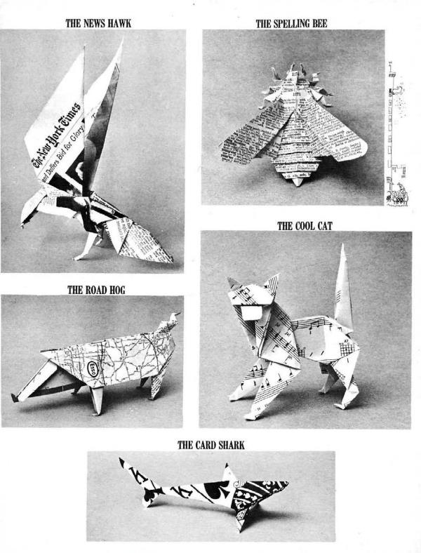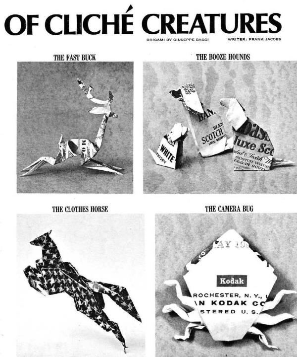 The article 'Mad Origami Zoo of Cliche Creatures' by Giuseppe Baggi appeared in 'Mad Magazine' Issue 129 of September 1969. The designs were folded by, and many were probably also designed by, Giuseppe Baggi, from media appropriate to the title of the design. However: The Wall Street Bulls and Bears designs are 'Longhorn Bull' by George Rhoads and 'Polar Bear Cub' by Samuel Randlett. The Song Bird is by Ligia Montoya. The Road Hog is by George Rhoads. **********