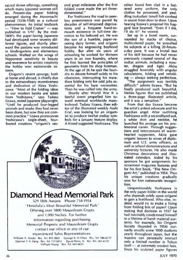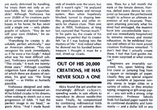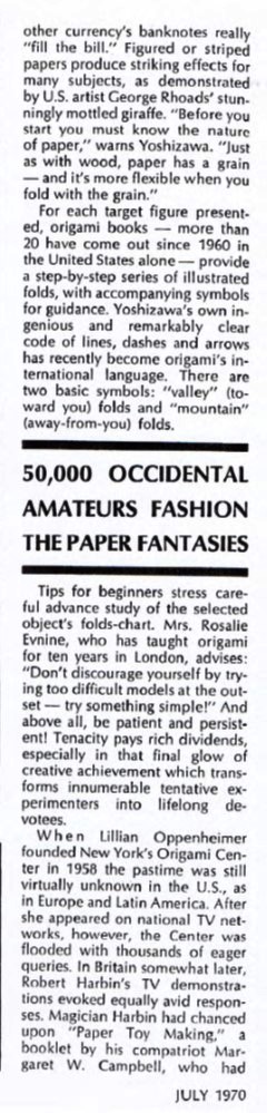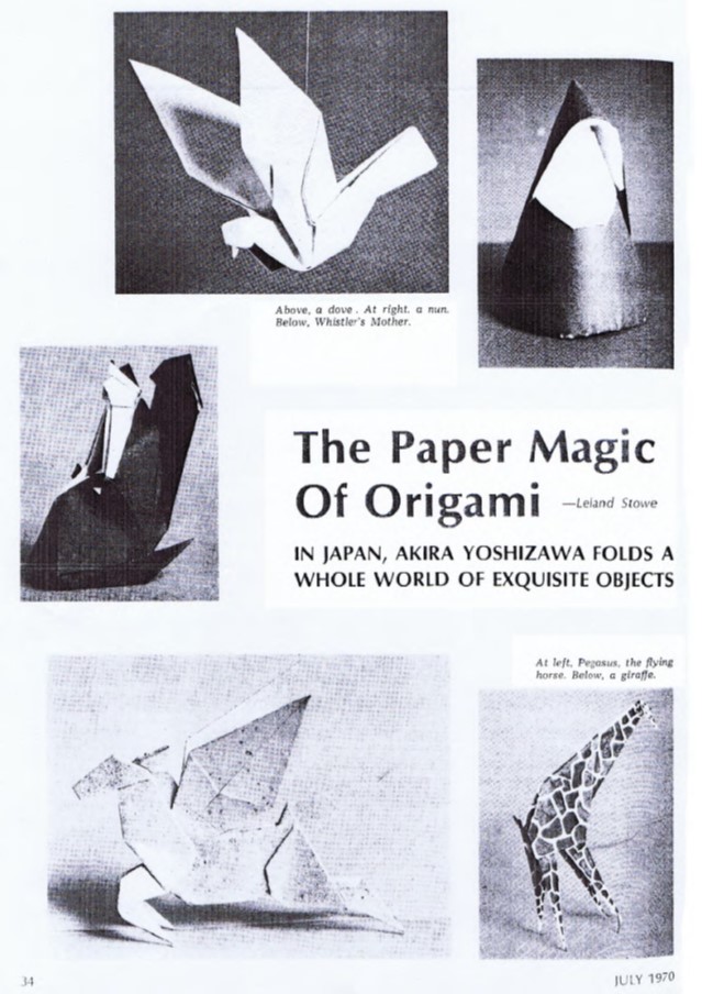 Campbell and Fred Rohm. My thanks to Michael LaFosse and Richard Alexander for sharing their copy of this article with me. According to Wikipedia, Leland Stowe 'won a Pulitzer Prize in 1930 for his coverage of the Reparations Conference in The Hague. Stowe was a runner-up for a second Pulitzer Prize in 1940 for his work as a war correspondent in World War II and his coverage of the Russo-Finnish War.' 'In 1955, he became a professor of journalism at the University of Michigan in Ann Arbor. During his tenure, he alternated between teaching one semester each academic year and working as an editor and staff writer for Reader's Digest.' His article in Beacon Magazine was subsequently republished, in a slightly different form, in the USA version of the August 1970 'Reader's Digest' which claimed to have a worldwide circulation of over 29 million copies in 13 languages. The article was subsequently republished, again in slightly different forms, in the UK edition in October 1970, in the Spanish language edition in November 1970 and in the French and Italian language editions in December 1970. It is quite possible that it was also published in many other languages as well, but I have no evidence of this at present. Since 'Reader's Digest' ostensibly existed to republish work that had previously appeared elsewhere, it is conceivable that Leland Stowe seeded the article in this relatively obscure magazine so that he could then publish it in that much more influential magazine. The sources for the article would seem to have been conversations with Akira Yoshizawa, his mentor Tadasu Iizawa and Lillian Oppenheimer. ********** The initial illustrations show: The origin of the Pegasus is not stated. It is presumably by Yoshizawa. Dove, Nun,and Self-Portrait by Akira Yoshizawa. Whistler's Mother by Fred Rohm. Giraffe by George Rhoads. There is also a smaller photo showing various other Yoshizawa designs (including what seems to be a version of Honda's Peacock). ********** The content of the article can be broken down into the following main sections: Description of a visit to Yoshizawa's home and of watching him fold Some basic historical notes on the origin of origami Biographical detail about Yoshizawa and his relationship with Tadasu Iizawa The creation of Yoshizawa's Cicada (not illustrated) Information about Lillian Oppenheimer and The Origami Center also mentioning Rosalie Evnine, Robert Harbin and Fred Rohm. ********** The article contains some obvious errors: Yoshizawa was not the first to produce a four-legged animal (even from a single sheet). The author seems unaware of the Western influence on Japanese paperfolding through the introduction of kindergarten education Robert Harbin's TV series 'Mr Left and Mr Right' was first broadcast in 1955. It was therefore not 'somewhat later' than the foundation of The Origami Center in 1959. It was Frieda Lourie rather than Lillian Oppenheimer who introduced origami as a therapy at Bellevue Hospital. Origami was not 'virtually unknown in the USA' when Lillian Oppenheimer founded The Origami Center. **********
